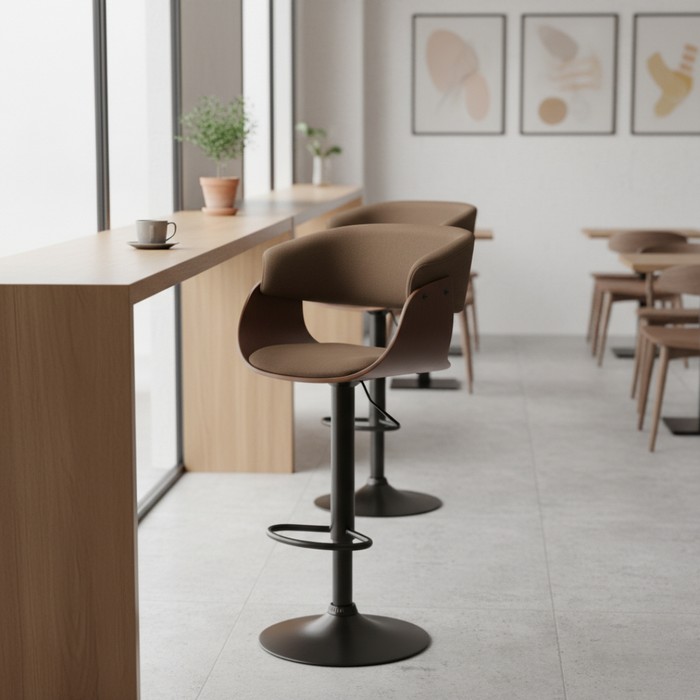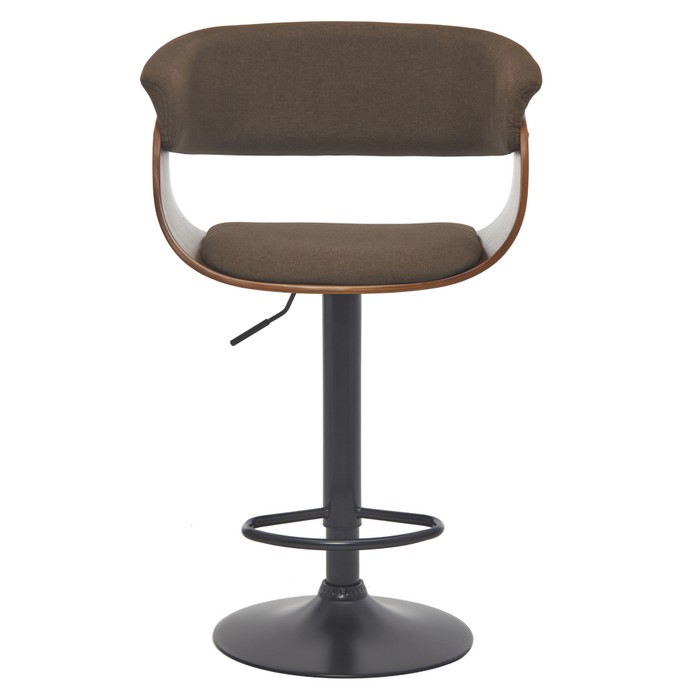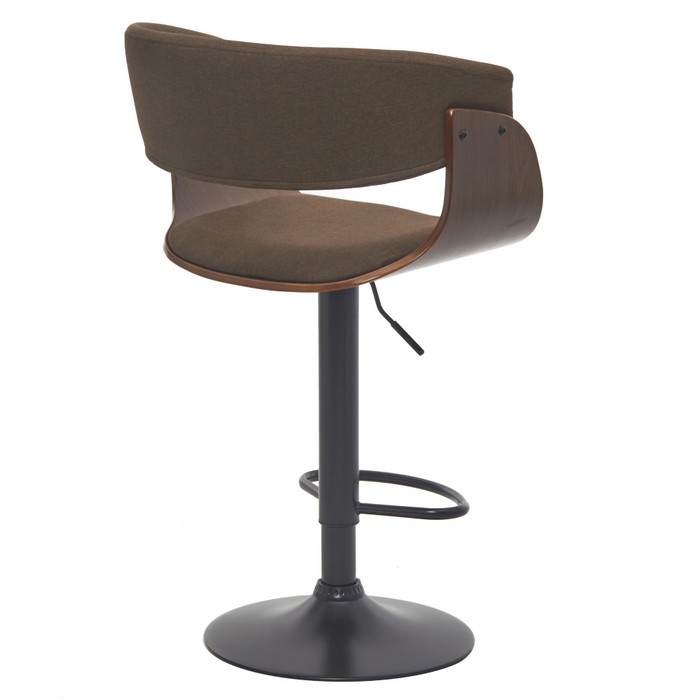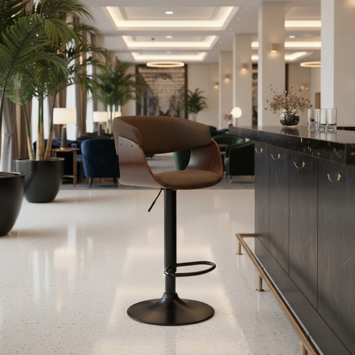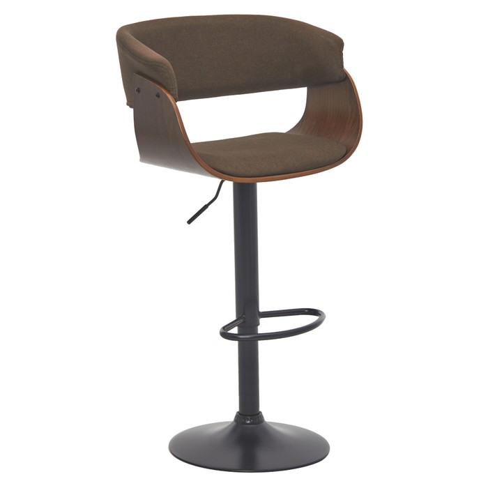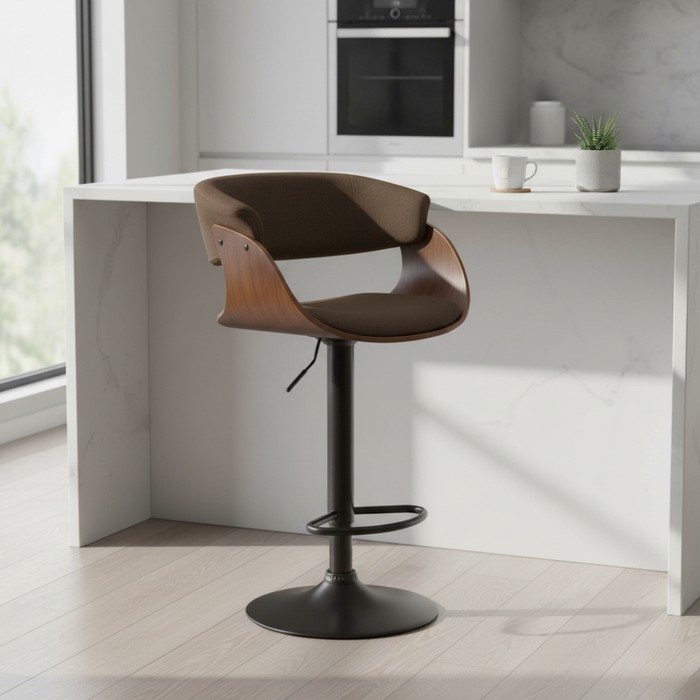 Barová stolička ELKIN predstavuje spojenie moderného dizajnu a maximálneho pohodlia. Zaujme netradične tvarovaným sedákom a precíznym spracovaním detailov. Sedacia časť je čalúnená hnedou látkou s vysokou odolnosťou proti oderu (až 80 000 cyklov podľa testu Martindale), čo zaručuje dlhú životnosť aj pri každodennom používaní. Elegantné drevené prvky v orechovom odtieni dodávajú stoličke hrejivý a nadčasový charakter, ktorý ľahko zapadne do moderných aj industriálnych interiérov. Stabilitu zabezpečuje pevná čierna kovová konštrukcia s okrúhlou podstavou s priemerom 41 cm. Súčasťou je aj praktická kovová opierka na nohy pre ešte väčší komfort pri sedení. Stolička je otočná a disponuje výškovo nastaviteľným sedadlom v rozmedzí 48–69 cm, pričom celková výška dosahuje 86-107 cm. Rozmery stoličky sú (ŠxH): 60x50 cm, sedák má šírku 45 cm a hĺbku 40 cm, chrbtová opierka je široká 47 cm a vysoká 31 cm. Model unesie až 100 kg a je dodávaný v demonte. Vďaka svojmu dizajnovému prevedeniu je ideálny do kuchýň, k barovým pultom, ale aj do kaviarní či moderných gastro prevádzok.