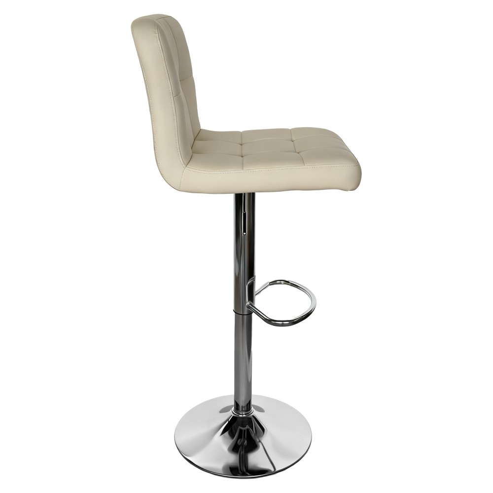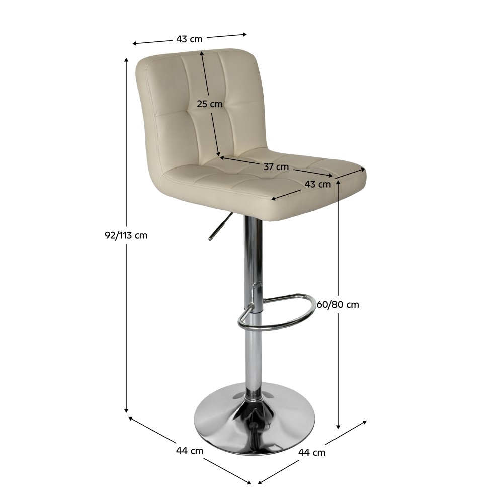 Barová stolička KANDY 2 NEW je štýlovým doplnkom, ktorý v sebe spája moderný dizajn a vysoký komfort sedenia. Čalúnenie z kvalitnej ekokože v elegantnej béžovej farbe v kombinácii s chrómovou kovovou konštrukciou pôsobí sviežo, nadčasovo a dokonale zapadne do modernej jedálne či kuchyne. Trendové dekoratívne prešívanie dodáva stoličke jedinečný a atraktívny vzhľad. Sedadlo je otočné a výškovo nastaviteľné v rozmedzí od 60 do 80 cm, pričom nastavenie prebieha jednoducho pomocou praktickej páčky. Vďaka tomu si výšku sedenia ľahko prispôsobíte aktuálnym potrebám a výške pultu. Rozmery stoličky sú (ŠxHxV): 44x44x92-113 cm a hĺbka sedu 37 cm zabezpečuje pohodlné sedenie. Použitá ekokoža sa vyznačuje vysokou odolnosťou, keďže podľa testu Martindale dosahuje až 100 000 oderov. Barová stolička má nosnosť do 100 kg a dodáva sa v demonte. Stolička je ideálnou voľbou pre tých, ktorí hľadajú funkčný, pohodlný a zároveň dizajnovo výrazný kus nábytku.