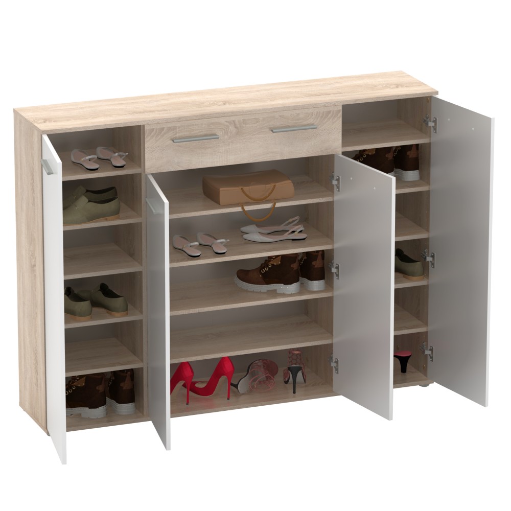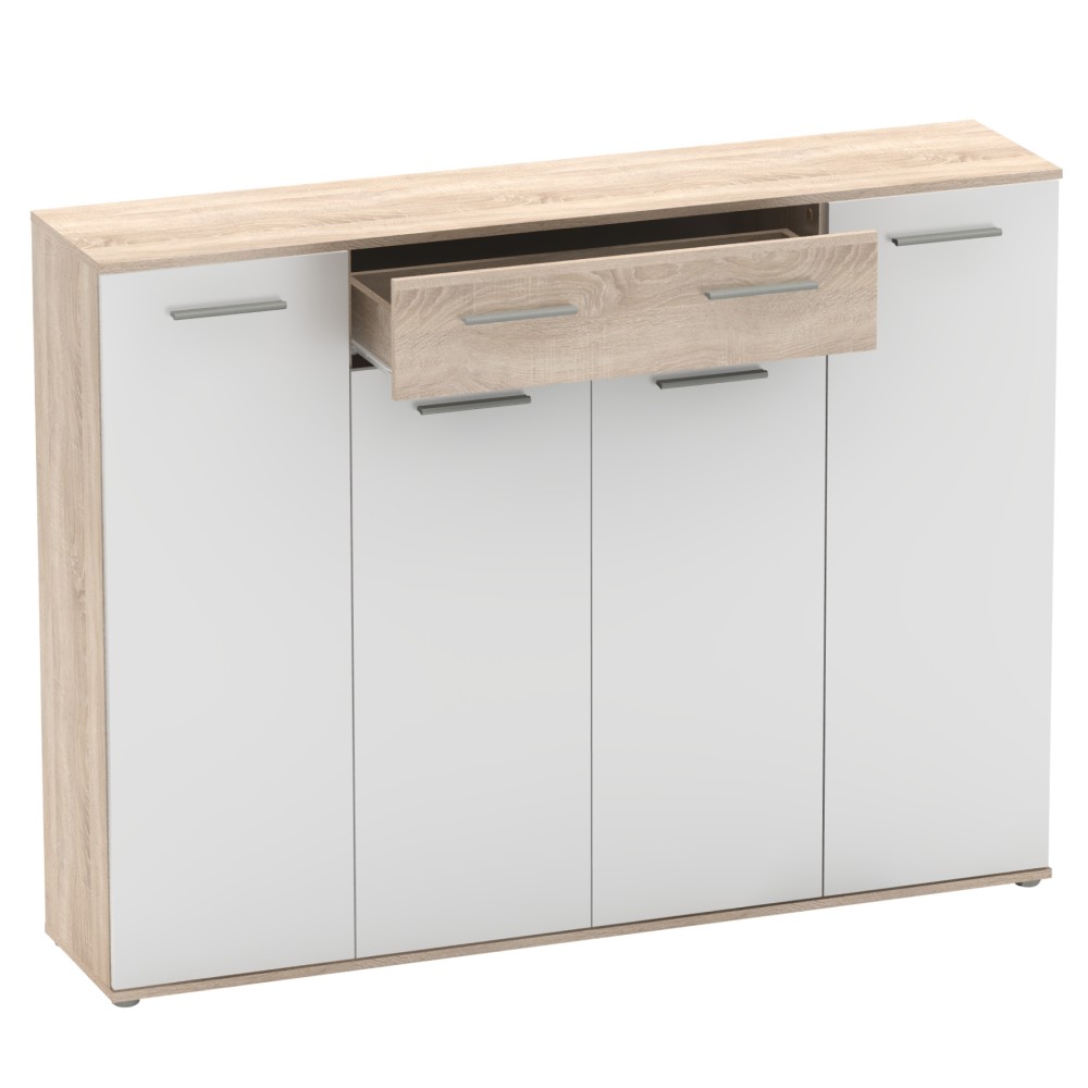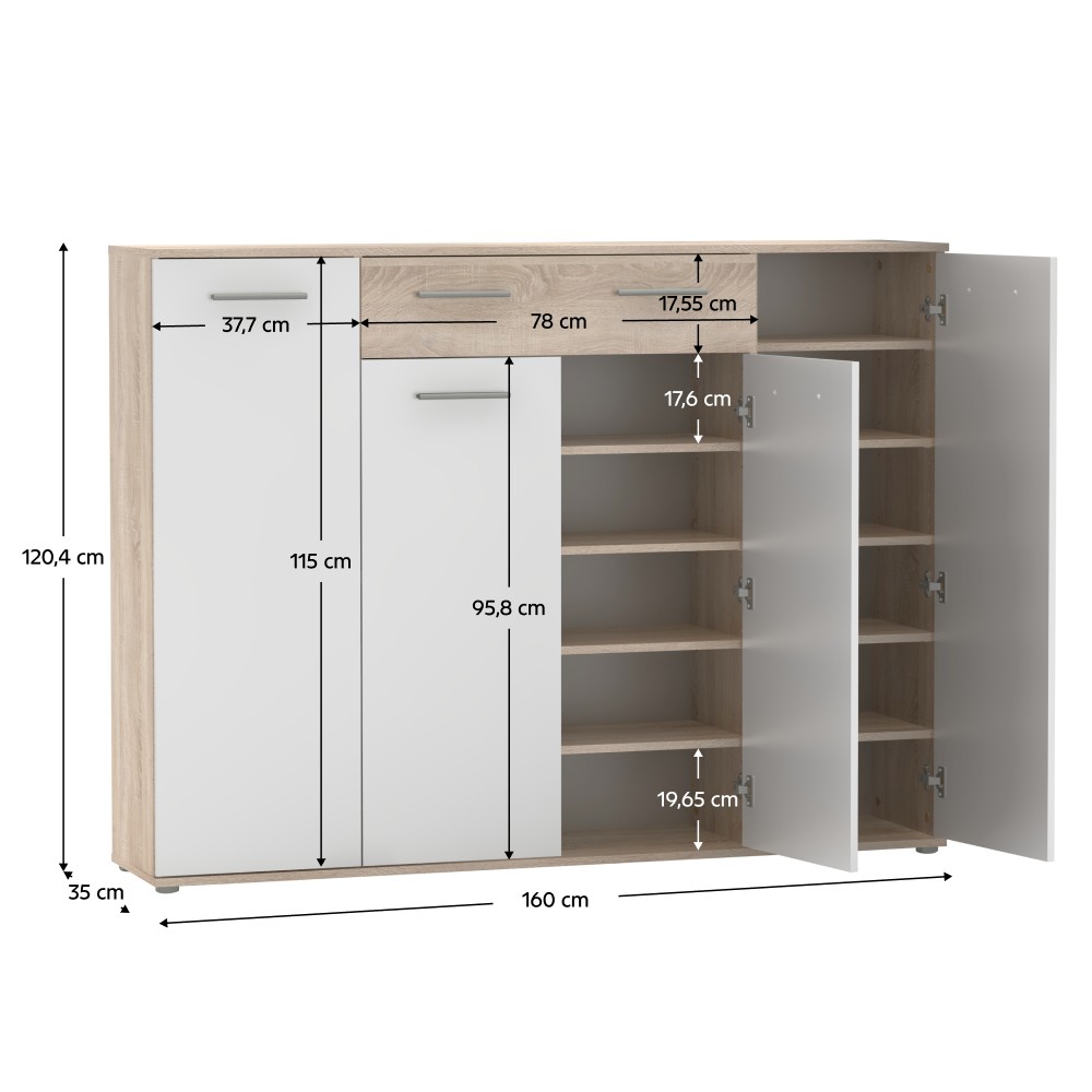 Botník ALEXIS je vyrobený z odolnej laminovanej DTD s hrúbkou 1,6 cm v elegantnej farebnej kombinácii dub sonoma a biela. Jeho rozmery sú (ŠxHxV): 160x35x120,4 cm, čo z neho robí praktické riešenie pre predsieň či chodbu. Skrinka je štvordverová a vo vnútri sa nachádzajú police s nosnosťou 5 kg, ktoré poskytujú dostatok miesta na topánky. Horná doska unesie až 10 kg, takže ju možno využiť aj na dekorácie alebo odkladanie tašiek. Súčasťou je aj praktický šuplík s rozmermi (ŠxV): 78x17,55 cm a nosnosťou 5 kg, vhodný na odkladanie kľúčov, rukavíc alebo iných drobností. Moderný vzhľad dotvárajú strieborné úchytky z PVC. Skrinka stojí na klzákoch, ktoré uľahčujú manipuláciu a presúvanie. Ako kvalitný slovenský výrobok sa dodáva v demonte a pre väčšiu bezpečnosť sa odporúča pripevniť ju k stene.