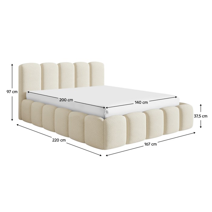 Posteľ CLAUDIA 140 vnáša do spálne pocit luxusu, elegancie a moderného komfortu. Jej mäkko zaoblené čalúnené línie pôsobia útulne a sofistikovane zároveň, pričom vysoké prešívané čelo nielen zvýrazňuje dizajn postele, ale poskytuje aj pohodlnú oporu pri čítaní, oddychu či relaxe pred spaním. Je potiahnutá kvalitnou smotanovou látkou Murano 832 s jemnou textúrou a mimoriadnou oderuodolnosťou až 100 000 cyklov podľa testu Martindale, čo zaručuje dlhú životnosť a zachovanie elegantného vzhľadu. Stabilitu zabezpečuje pevná konštrukcia z kombinácie smrekového a borovicového dreva, surovej dosky, MDF a kovu. Celkové rozmery postele sú (ŠxHxV): 167x220x97 cm a je určená pre matrac s plochou na spanie 140x200 cm. Výška po rošt dosahuje 19,5 cm, výška bočnice 37,5 cm a nosnosť jedného lôžka je 125 kg. Posteľ je dodávaná s výklopným roštom s kovovým rámom, ktorý je vybavený plynovými piestami pre jednoduché, tiché a pohodlné otváranie. V spodnej časti sa nachádza praktický úložný priestor, ideálny na uloženie posteľnej bielizne či sezónnych vecí. Posteľ je dodávaná bez matraca, pričom odporúčaná výška matraca je 20 cm a jeho zapustenie je 14 cm. Vhodný matrac s rozmerom 140x200 cm je možné dokúpiť z ponuky. Posteľ stojí na plastových klzákoch v čiernej farbe s výškou 1 cm, ktoré chránia podlahu a uľahčujú manipuláciu. Vďaka svojmu elegantnému dizajnu a premysleným detailom je posteľ ideálnou voľbou pre tých, ktorí hľadajú spojenie pohodlného spánku a estetického zážitku. Dodáva sa v demontovanom stave.