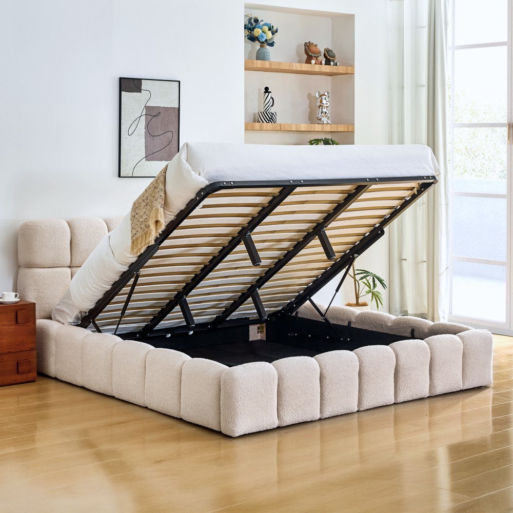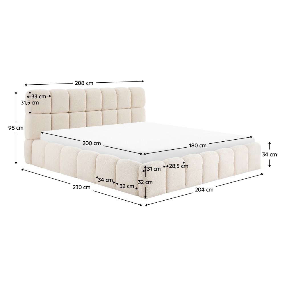 Posteľ SORELA je štýlovým kúskom, ktorý v sebe spája moderný dizajn, pohodlie a elegantný vzhľad. Už na prvý pohľad upúta mäkko čalúneným čelom s jemným prešívaním, ktoré pôsobí luxusne a zároveň vytvára príjemnú atmosféru na každodenný oddych. Vďaka nadčasovému vzhľadu sa prirodzene hodí do moderných aj klasických interiérov a dodá spálni pocit útulnosti a štýlu. Čalúnenie je vyhotovené z látky Bouclé v béžovej farbe, ktorá je známa svojím príjemným povrchom a jemnou štruktúrou, pričom konštrukcia postele je vyrobená z drevotriesky doplnenej penou. Textília dosahuje oderuodolnosť 40 000 cyklov podľa testu Martindale, čo zaručuje jej dlhú životnosť. Rozmery postele sú (ŠxHxV): 208x230x98 cm a plocha na spanie má veľkosť 180x200 cm. Výška po rošt je 24 cm, výška bočnice 34 cm a jej šírka je 11,5 cm. Čelo postele má výšku 98 cm, pričom od bočnice meria 64 cm, jeho hrúbka je 17 cm a pri nohách 11,5 cm. Nosnosť lôžka je 140 kg. Posteľ je vybavená praktickým úložným priestorom, ktorý sa nachádza v spodnej časti a otvára sa pomocou výklopného roštu s kovovým rámom a plynovými piestami, vďaka čomu je manipulácia jednoduchá a pohodlná. Rošt obsahuje lamely z topoľovej preglejky. Posteľ sa dodáva bez matraca, pričom je možné vybrať si vhodný matrac z ponuky, ideálne s rozmerom 180x200 cm a odporúčanou výškou približne 20 cm. Zapustenie matraca je 7 cm. Posteľ stojí na kovových nožičkách v čiernej farbe s rozmermi (ŠxHxV): 4x4x2,4 cm. Vyznačuje sa elegantným dizajnom s vysokým prešívaným čelom a je dodávaná v demonte, čo umožňuje jednoduchšiu prepravu a montáž.