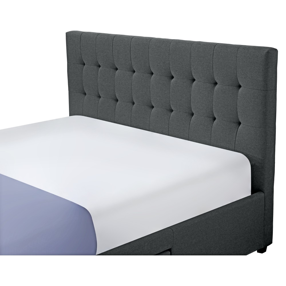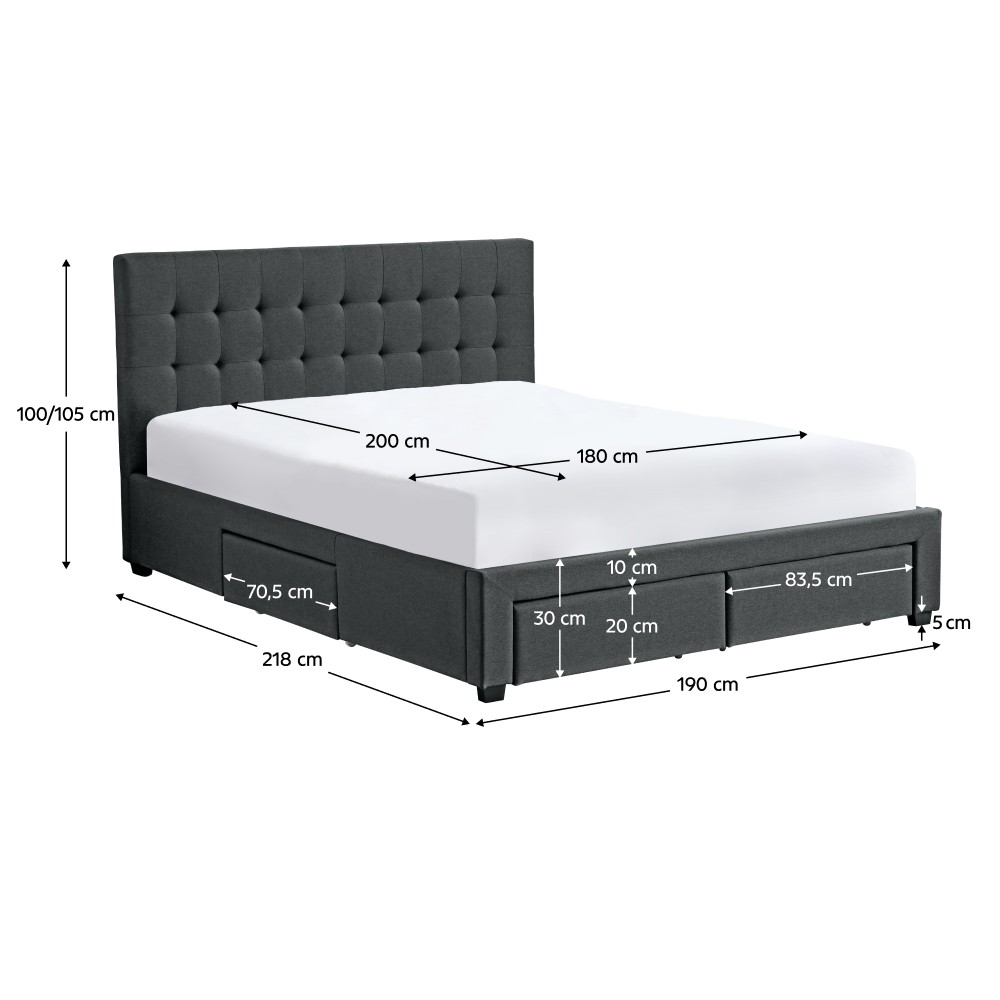 Manželská posteľ MILARA 180 premení vašu spálňu na elegantný a funkčný priestor. Je čalúnená mäkkou Velvet látkou v modernej sivej farbe s odolnosťou 80 000 oderov podľa testu Martindale, čo zaručuje dlhú životnosť a nadčasový vzhľad. Dominantné vysoké čelo s dekoratívnym prešívaním pôsobí štýlovo a zároveň poskytuje pohodlnú oporu pri čítaní alebo relaxe. Posteľ má celkové rozmery (ŠxHxV): 190x218x105 cm, pričom plocha na spanie je 180x200 cm. Výška po rošt je 31,2 cm, výška bočnice 30 cm a zapustenie matraca 3,8 cm, čo zaručuje stabilitu a pohodlie. Konštrukciu dopĺňajú čierne borovicové nožičky s výškou 5 cm, ktoré posteľ vizuálne odľahčujú a zároveň uľahčujú upratovanie. Milara ponúka aj praktický úložný priestor v podobe štyroch šuplíkov. Dve menšie zásuvky majú vnútorné rozmery (ŠxHxV): 58x48x14 cm a dve väčšie (ŠxHxV): 74x48x14 cm, pričom nosnosť každého šuplíka je 8 kg. Posteľ je vybavená kvalitným lamelovým roštom s rozostupmi medzi lamelami 5 cm, ktorý zabezpečí správnu oporu matraca. Dodáva sa bez matraca, pričom odporúčame matrac s rozmerom 180 × 200 cm a maximálnou výškou 20 cm. Nosnosť postele je až 250 kg na osobu, čo garantuje bezpečnosť a dlhodobé používanie. Dodáva sa v demonte, takže manipulácia a montáž sú jednoduchšie.