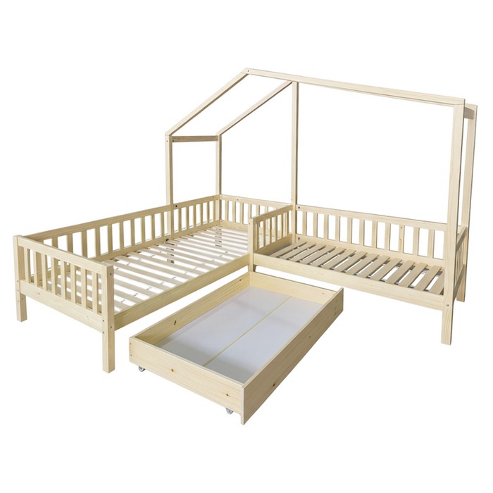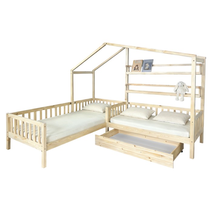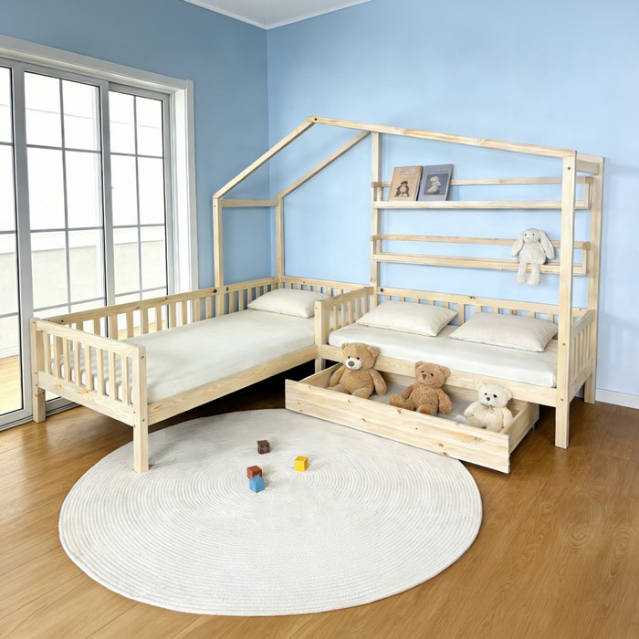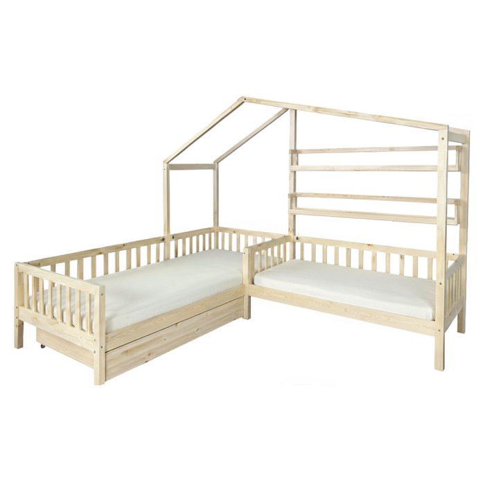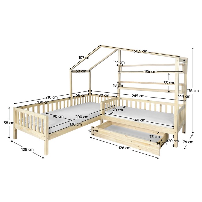 Montessori prístup vo výchove kladie dôraz na samostatnosť, prirodzený rozvoj a rešpektovanie potrieb dieťaťa. Dôležitou súčasťou tohto prístupu je aj prostredie, v ktorom dieťa vyrastá. Deti by mali mať priestor prispôsobený ich výške, možnostiam a zvedavosti, aby mohli bezpečne objavovať svet okolo seba a rozvíjať svoju nezávislosť. Práve preto sa v detských izbách čoraz častejšie objavuje nábytok inšpirovaný Montessori princípmi, ktorý podporuje pohodlie, bezpečnosť aj hravosť. Rohová detská posteľ ENOLA je snom každého malého objaviteľa a zároveň praktickým riešením pre rodičov, ktorí chcú vytvoriť krásnu, funkčnú a bezpečnú detskú izbu. Moderný dizajn v tvare domčeka a v tvare písmena L premení obyčajné spanie na čarovný priestor vhodný na oddych, čítanie rozprávok aj detské hry. Konštrukcia postele je vyrobená z masívneho borovicového dreva v kombinácii s lakovanou MDF, čo zabezpečuje pevnosť, stabilitu a dlhú životnosť pri každodennom používaní. Praktická zásuvka pod posteľou poskytuje ideálny úložný priestor na posteľnú bielizeň, hračky alebo sezónne veci. Súčasťou sú aj otvorené police, ktoré ponúkajú miesto na knihy, dekorácie alebo obľúbené detské poklady. Je vyhotovená v prírodnej farbe, ktorá pôsobí čisto a ľahko sa kombinuje s rôznymi štýlmi detských izieb. Súčasťou balenia je rolovaný rošt z preglejky, ktorý zabezpečuje spoľahlivú oporu pre matrac. Posteľ sa dodáva bez matraca, pričom odporúčame dokúpiť matrac s rozmerom 90x200 cm a 70x140 cm z našej ponuky. Detská posteľ premení detskú izbu na miesto plné fantázie, kde sa spájajú pohodlie, bezpečie a hravý dizajn.