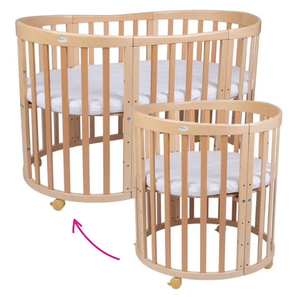Detská rastúca oválna postieľka NIKO 7v1 je vyrobená z kvalitného bukového dreva v prírodnej farbe a je navrhnutá tak, aby sa prispôsobovala potrebám dieťaťa od narodenia až po školský vek. Ponúka praktické riešenie pre rodičov, ktorí chcú spájať estetiku, pohodlie a dlhodobé využitie v jednom výrobku. Postieľku možno používať na sedem spôsobov – funguje ako prístelka, ktorú je možné pripevniť k manželskej posteli bezpečnostným pásom, ďalej ako menšia postieľka pre deti do 6 mesiacov s gumovými kolieskami a prebaľovacím pultom, pričom kolieska sú vybavené brzdou. Ak nie sú zabrzdené, postieľku možno jednoducho presúvať podľa potreby. Pre deti od 6 do 36 mesiacov je určené použitie väčšej postieľky, ktorá vznikne spojením všetkých dielov. Súčasťou je rošt, ktorý možno nastaviť do piatich výškových polôh - 7 cm, 18 cm, 30 cm, 41 cm a 49 cm. Po znížení roštu na najnižšiu polohu je možné postieľku používať ako ohrádku alebo nízku postieľku, do ktorej si dieťa samo vojde. Keď dieťa postieľku prestane využívať, jednotlivé časti sa dajú zostaviť do dvoch kresielok a stolíka vhodného na hranie alebo stolovanie. Bukové drevo je ošetrené ekologickým náterom na báze vody a spĺňa všetky bezpečnostné požiadavky. Balenie obsahuje trojdielny matrac z peny T25 s bavlneným poťahom prateľným pri 30 °C, gumové kolieska s brzdou a montážnu sadu. Maximálna výška matraca je 6 cm, výška koliesok 6 cm a nosnosť postieľky je 80 kg. Vonkajšie rozmery aj výška od podlahy sú uvedené bez koliesok. Postieľka je oválna, bez úložného priestoru a dodávaná v demonte. Varianty zostavenia postieľky 7v1 zahŕňajú prístelku, malú postieľku s prebaľovacím pultom, väčšiu postieľku, väčšiu postieľku s bočným vstupom, ohrádku, ohrádku s bočným vstupom a kresielka so stolíkom.