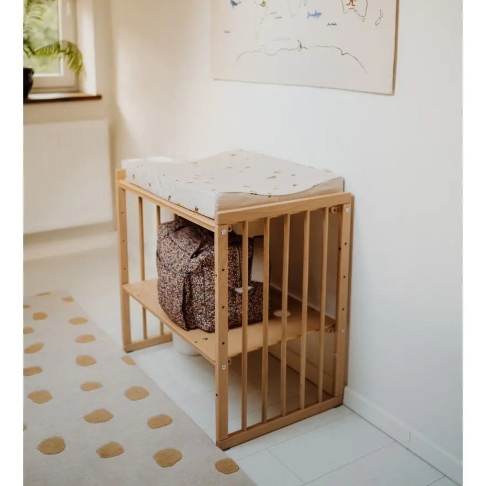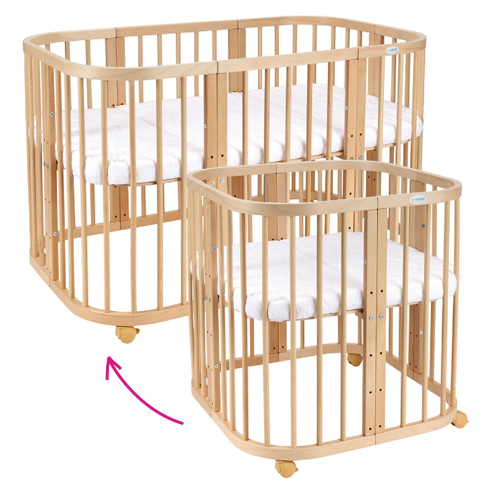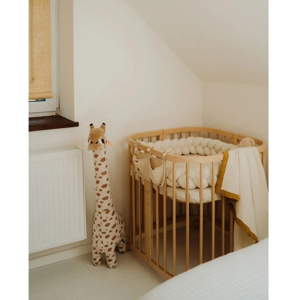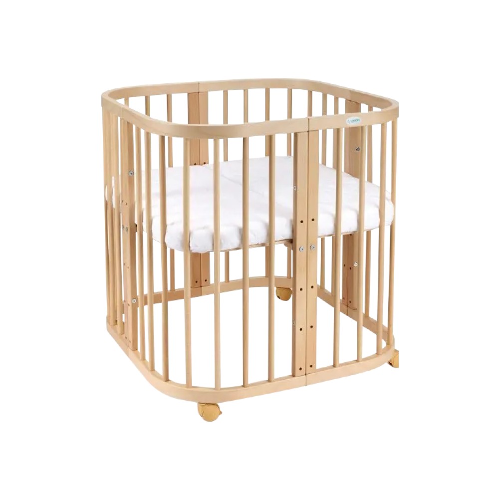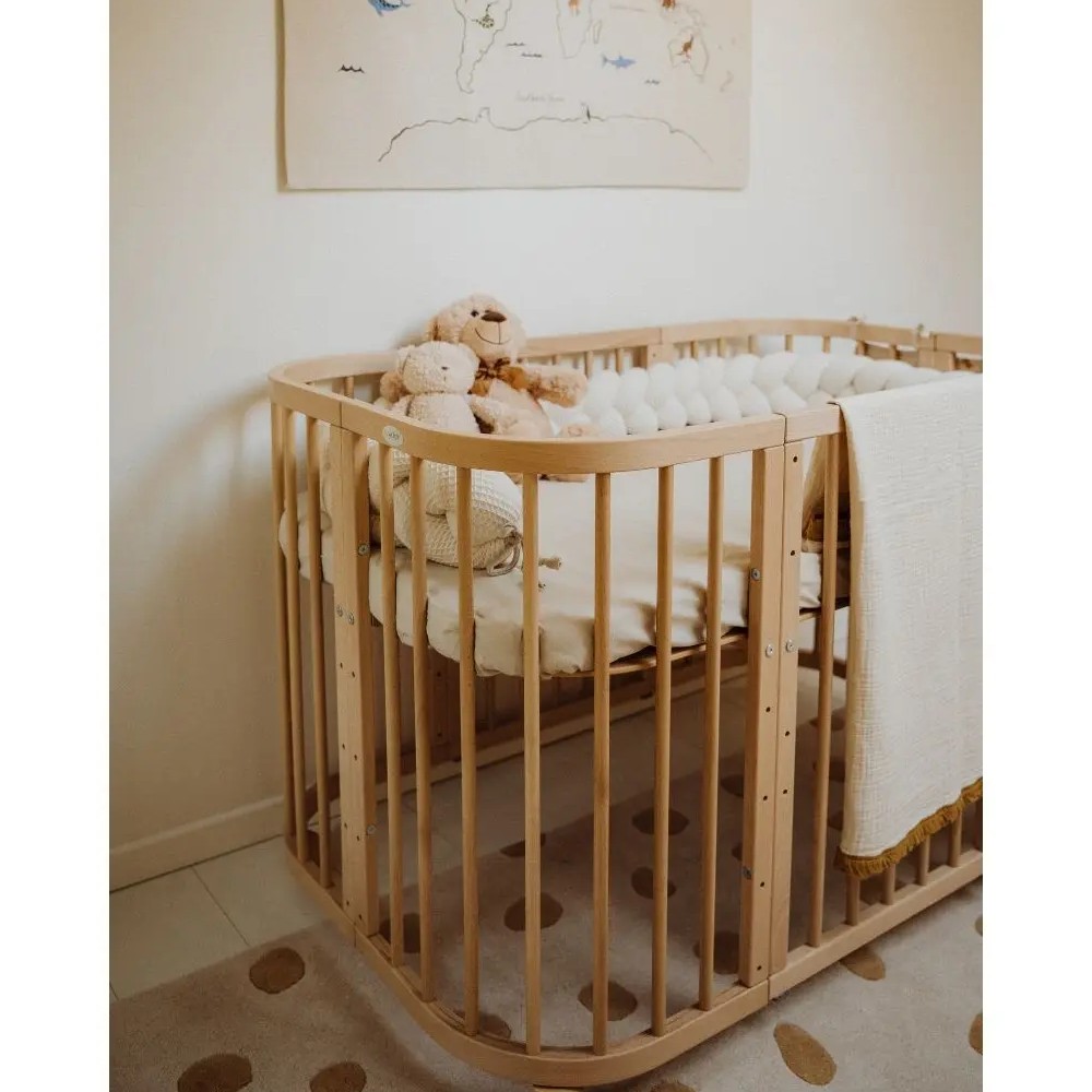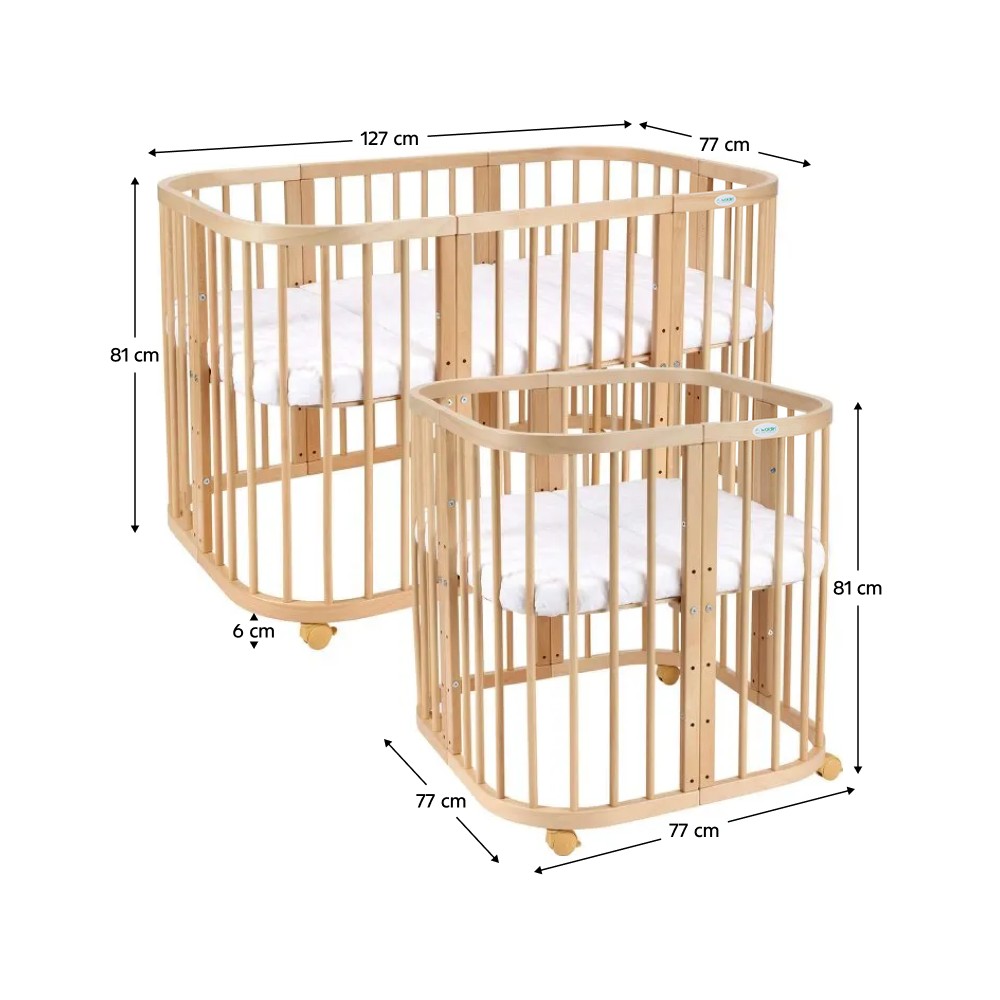 Detská rastúca postieľka LILI 7v1 je vyrobená z kvalitného bukového dreva v elegantnej prírodnej farbe a je navrhnutá tak, aby rástla spolu s vaším dieťatkom od narodenia až po školský vek. Ponúka praktické riešenie pre rodičov, ktorí hľadajú kombináciu komfortu, dizajnu a viacúčelového využitia v jednom výrobku. Postieľku možno používať na sedem rôznych spôsobov. Slúži ako prístelka, ktorú je možné umiestniť k manželskej posteli a bezpečne upevniť priloženým pásom. Pre najmenšie deti do 6 mesiacov je pripravený menší variant postieľky s gumovými kolieskami a prebaľovacím pultom, pričom kolieska sú vybavené brzdou pre bezpečné zafixovanie. Keď dieťatko rastie, všetky diely je možné spojiť do väčšej postieľky určenej pre deti od 6 do 36 mesiacov. Súčasťou je rošt s nastaviteľnou výškou v piatich polohách - 7 cm, 18 cm, 30 cm, 41 cm a 49 cm. Pri použití gumových koliesok dosahuje najvyššia poloha 55 cm. Po znížení roštu možno postieľku využiť ako ohrádku alebo nízku postieľku, do ktorej si dieťa dokáže samostatne vojsť. Keď dieťa už postieľku nepotrebuje, jednotlivé diely sa dajú premeniť na dve kresielka a praktický stolík vhodný na hranie či stolovanie. Súčasťou balenia je trojdielny matrac z peny T25 s bavlneným poťahom, ktorý je možné prať pri 30 °C, ďalej gumové kolieska s brzdou, bezpečnostný pás a montážna sada. Maximálna výška matraca je 6 cm a nosnosť postieľky je 80 kg. Postieľka je dodávaná v demonte a neobsahuje úložný priestor. Lili 7v1 ponúka tieto varianty zostavenia: prístelka, malá postieľka s prebaľovacím pultom, väčšia postieľka, väčšia postieľka s bočným vstupom, ohrádka, ohrádka s bočným vstupom a kresielka so stolíkom.