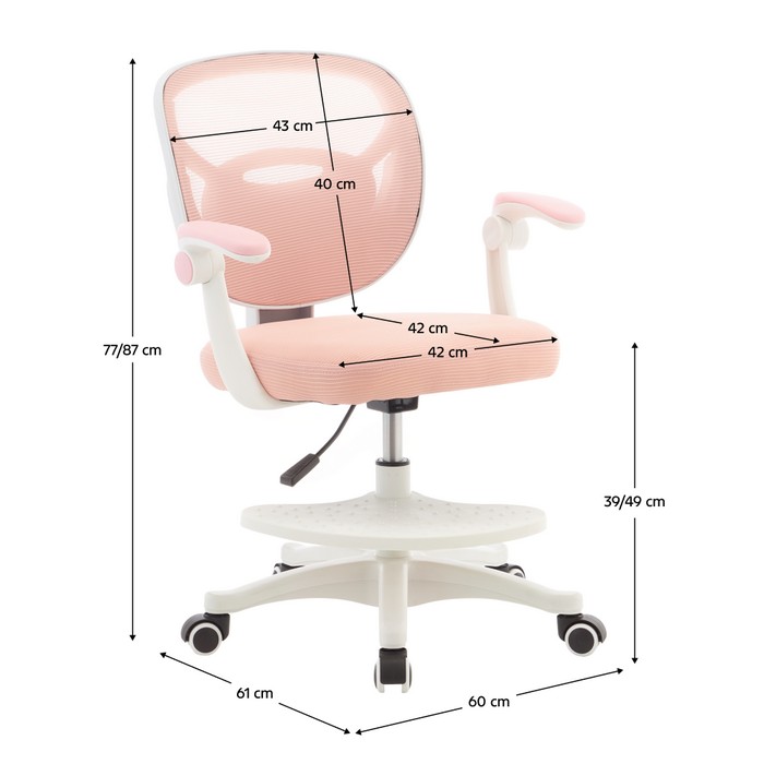 Pohodlie a moderný štýl sa dokonale prelínajú v otočnej stoličke TREXA, ktorá je ideálnou voľbou do detskej izby aj študentského kútika. Vďaka rozmerom (ŠxHxV): 60x61x77-87 cmpôsobí kompaktne, no zároveň poskytuje dostatok priestoru na komfortné sedenie. Výšku sedu je možné nastaviť v rozmedzí 39 až 49 cm, takže sa jednoducho prispôsobí výške dieťaťa či študenta. Sedák so šírkou a hĺbkou 42 cm spolu s chrbtovou opierkou širokou 43 cm a vysokou 40 cm zabezpečujú pohodlnú oporu chrbta aj pri dlhšom učení. Nastaviteľná podnožka na nohy ponúka správnu oporu, pričom ju možno v prípade potreby úplne odňať. Praktické opierky na ruky disponujú funkciou sklápania, čo zvyšuje variabilitu a šetrí miesto pri zasunutí stoličky k písaciemu stolu. Stolička je vyrobená zo sieťoviny a plastu, pričom sieťovina v ružovom prevedení je priedušná a dosahuje oderuodolnosť 90 000 cyklov podľa testu Martindale, čo zaručuje jej dlhú životnosť. Biely plastový rám podčiarkuje moderný dizajn. Univerzálne kolieska sa plynulo pohybujú po mäkkých aj tvrdých podlahách, takže manipulácia so stoličkou je jednoduchá a bezproblémová. Unesie až 90 kg, dodáva sa v demonte a predstavuje spoľahlivú kombináciu moderného vzhľadu, bezpečnosti a vysokého komfortu na každodenné používanie.