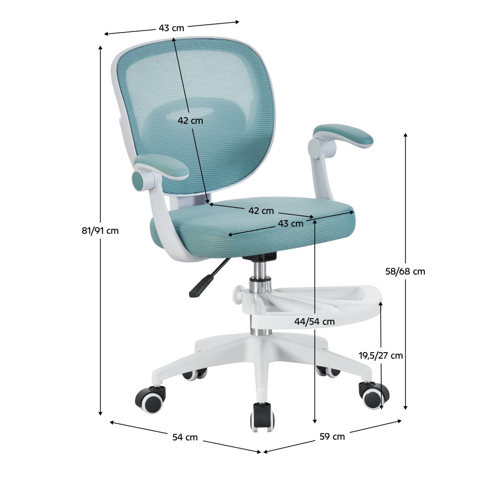 Otočná stolička TRIXI TYP 1 je výbornou voľbou pre rodičov, ktorí chcú svojmu dieťaťu dopriať pohodlie, štýl a zdravé sedenie. Okrem moderného dizajnu vyniká praktickými funkciami, ktoré sa dokonale prispôsobia meniacim sa potrebám dieťaťa. Výškovo nastaviteľné sedadlo (45 - 55 cm) umožňuje ergonomické nastavenie podľa výšky dieťaťa, zatiaľ čo nastaviteľná podnožka poskytuje stabilnú oporu pre nohy – v prípade potreby ju možno jednoducho odmontovať. Čalúnené sklápateľné podrúčky zabezpečujú pohodlie pri učení či hraní a zároveň umožňujú zasunutie stoličky pod stôl, čím sa šetrí miesto. Sedadlo aj chrbtová opierka sú potiahnuté vzdušnou sieťovinou v odtieni neomint, ktorá zaručuje príjemné sedenie aj počas dlhšieho používania. Stabilná podstava z bieleho plastu je vybavená univerzálnymi kolieskami, ktoré sa hladko pohybujú po mäkkých aj tvrdých povrchoch bez poškodenia podlahy. Stolička má kompaktné rozmery: šírka 59 cm, hĺbka 50 cm a nastaviteľná výška v rozmedzí 81 - 91 cm. Samotné sedadlo má šírku 43 cm a hĺbku 42 cm, čo zaručuje komfort aj pri dlhšom sedení. Chrbtová opierka s rozmermi 43x40 cm poskytuje spoľahlivú oporu chrbtici a prispieva k správnemu držaniu tela. Maximálne zaťaženie stoličky je 90 kg. Trixi Typ 1 tak spája estetiku, funkčnosť a ergonómiu v jednom - ideálne riešenie pre každodenné používanie v detskej izbe, ktoré myslí na pohodlie aj zdravý vývoj.