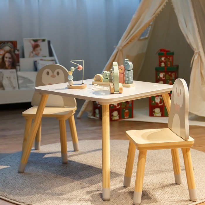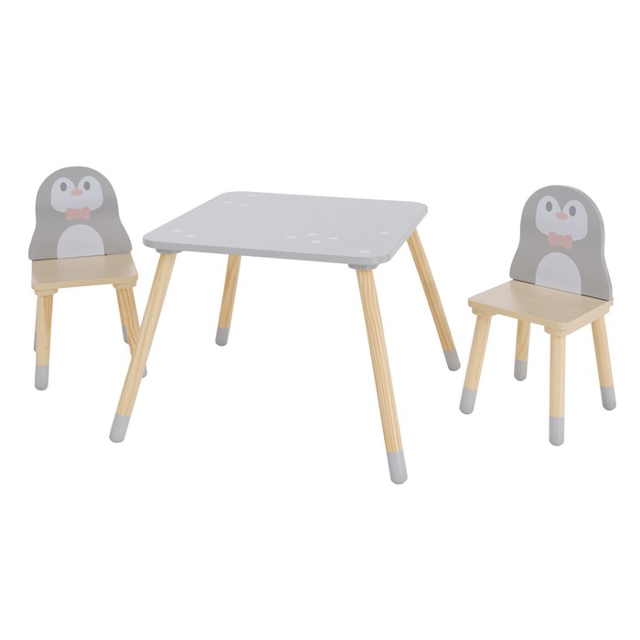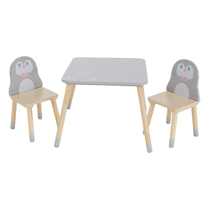Detský set SAVER TYP 2 s motívom tučniaka vytvára pre deti príjemné a hravé miesto na každodenné aktivity. Stolík a dve stoličky v bielo-sivom prevedení zdobia veselé ilustrácie, ktoré oživia každú detskú izbu a podporia fantáziu pri hre. Set je ideálny na kreslenie, skladanie puzzle, hranie či malé detské posedenia a rovnako dobre poslúži aj v herni alebo škôlke. Konštrukcia je vyrobená z kombinácie MDF a masívneho borovicového dreva, čo zaručuje pevnosť a dlhú životnosť. Všetky hrany sú zaoblené, aby sa minimalizovalo riziko poranenia. Stolík má rozmery (ŠxHxV): 50x50x42,5 cm a jeho nosnosť je 50 kg. Stoličky majú rozmery (ŠxHxV): 25,5x29x49,5 cm, výška sedu je 20 cm a nosnosť každej stoličky je 50 kg. Hrúbka použitého materiálu sa pohybuje od 1,2 do 1,5 cm. Set obsahuje jeden stolík a dve stoličky, pričom jeho veľkosť je prispôsobená deťom vo veku od 3 do 7 rokov. Produkt je určený na použitie v interiéri a odporúča sa čistiť ho jemne navlhčenou handričkou a následne utrieť do sucha. Z bezpečnostných dôvodov sa neodporúča umiestňovať ho blízko okna, aby ho dieťa nevyužilo ako schodík. Detský set spĺňa bezpečnostné normy EN 17191:2021 a dodáva sa v demonte pre jednoduchú montáž.
