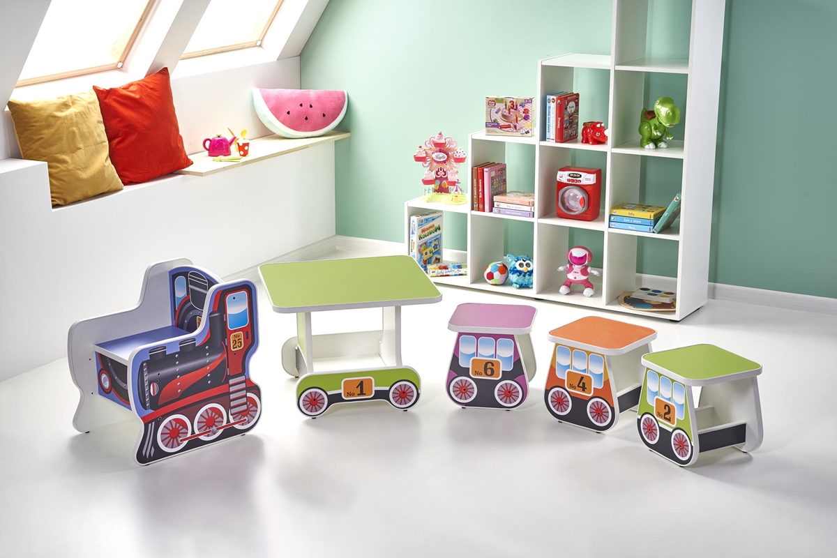 Detský stolík LOKOMO predstavuje doplnok vhodný do každej detskej izby. Konštrukcia je vyrobená z laminovanej drevotriesky a mäkké hrany z kvalitnej PVC. Rozmery stolíka sú (ŠxHxV): 60x60x45 cm. Stolík sa dodáva v zelenom farebnom prevedení, pričom na výber je aj v iných farebných vyhotoveniach. Jednotlivé prvky Locomo zaujmú najmä svojim originálnym dizajnom s motívom vláčika. Tento jedinečný nábytok bude neoddeliteľnou súčasťou každého sprievodcu. Vďaka svojim rozmerom sa hodí do menších priestorov. Ku krásnemu stolíku Lokomo môžno zakúpiť aj kreslo a ďalšie vagóniky (taburetky).