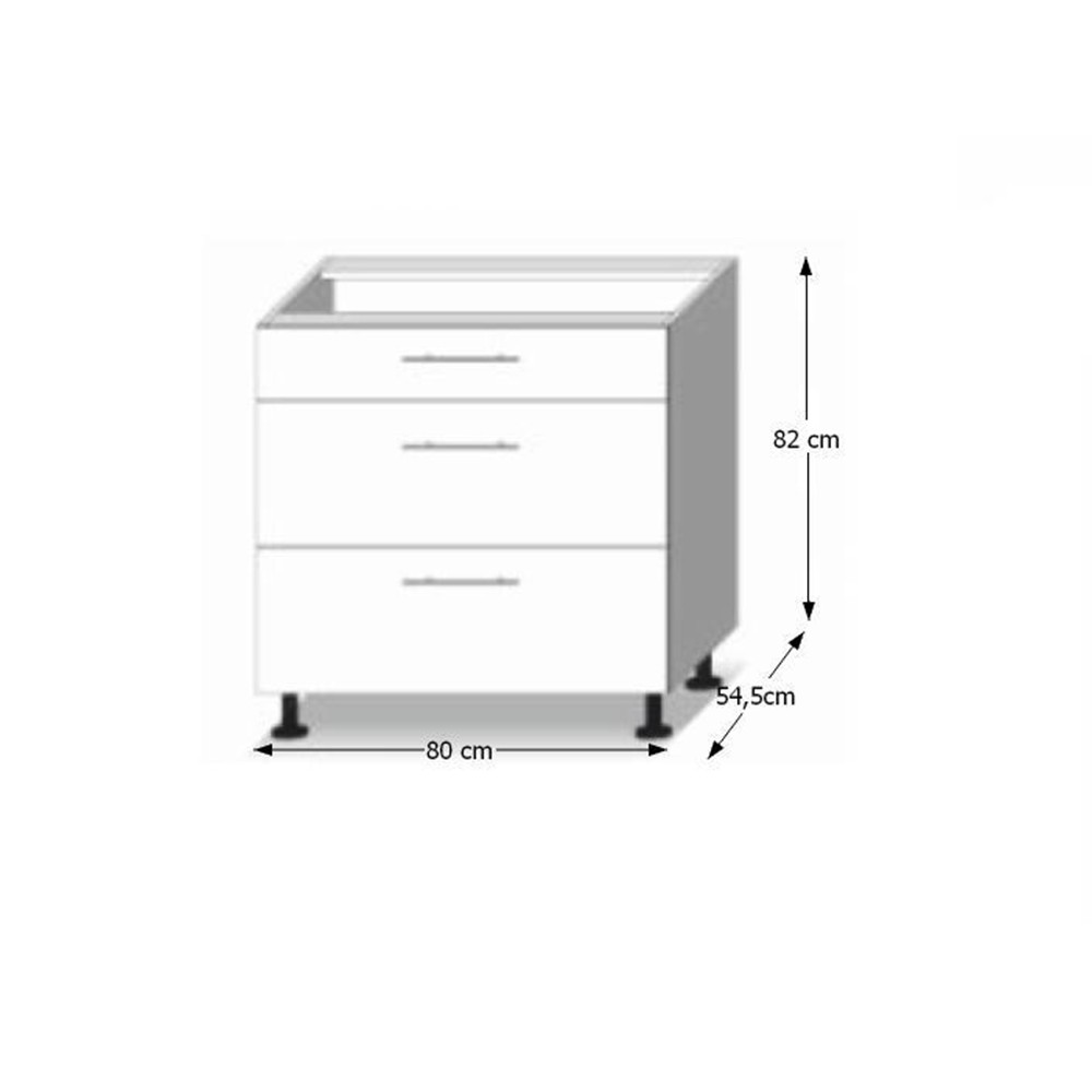 Dolná kuchynská skrinka LINE D80 3 je trojzásuvková skrinka, ktorú je možné kombinovať s ostatnými prvkami z modelovej rady Line. Materiál použitý na výrobu je laminovaná DTD. Korpus je vo farbe biela, fronty vo farbe dub sonoma. Skrinka sa dodáva s dolnou lištou a pracovnou doskou s hrúbkou 38 mm.