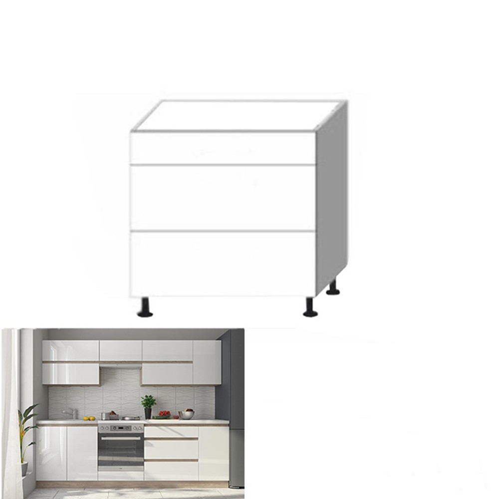 Dolná kuchynská skrinka LINE WHITE D80 3 je trojzásuvková skrinka, ktorú je možné kombinovať s ostatnými prvkami z modelovej rady Line White. Materiál použitý na výrobu je laminovaná DTD. Korpus je vo farbe dub sonoma, fronty vo farbe biely vysoký lesk. Namiesto klasických úchytiek pre otváranie dvierok je použitý systém zarážiek na okraji dvierok, čo ešte viac dotvára moderný a nadčasový vzhľad tejto kuchyne. Skrinka sa dodáva s dolnou lištou a pracovnou doskou s hrúbkou 38 mm.