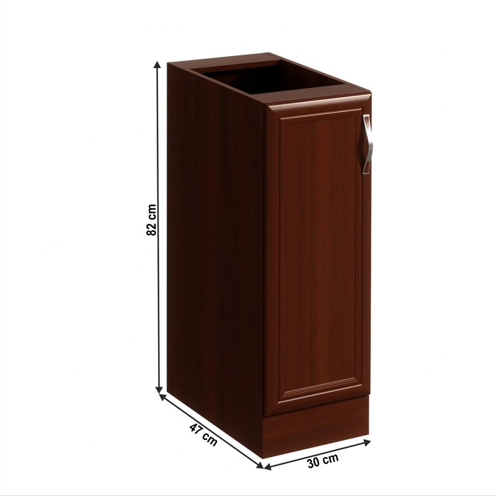 Rustikálna dolná kuchynská skrinka SICILIA D30 L je jednodverová skrinka, ktorá sa otvára pomocou plastovej úchytky. Vnútorný priestor je policou rozdelený na 2 odkladacie plochy. Ľavé prevedenie umožňuje otváranie dvierok do ľavej strany. Skrinka je na výber aj v pravom prevedení. Systém Sicilia je sektorová kuchynská zostava vyrobená v rustikálnom štýle, ktorá vyniká moderným a kvalitným spracovaním. Jedinečnú krásu dotvárajú detaily na čelných plochách a ornamenty na okrasných lištách. Kuchyňa spĺňa požiadavky aj tých najnáročnejších klientov. Trendové prevedenie vnesie teplo do vašej kuchyne. Korpus a dvierka sú vyrobené z laminovanej DTD v prevedení orech Milano. Ozdobné lišty sú z kvalitnej MDF a podčiarkujú rustikálny nádych kuchynskej linky. Dvierka a zásuvky sa otvárajú pomocou plastových úchytiek. Dolné kuchynské skrinky sa dodávajú bez pracovnej dosky, ktorú je možné doobjednať vo farebnom prevedení royal beigemarble a s hrúbkou 2,8 cm. Z jednotlivých prvkov zostavy si môžete vyskladať kuchynskú linku podľa vašich potrieb a predstáv. Ak vám nevyhovuje farba, je možné si vybrať komponenty aj v svetlom prevedení biela / sosna Andersen.