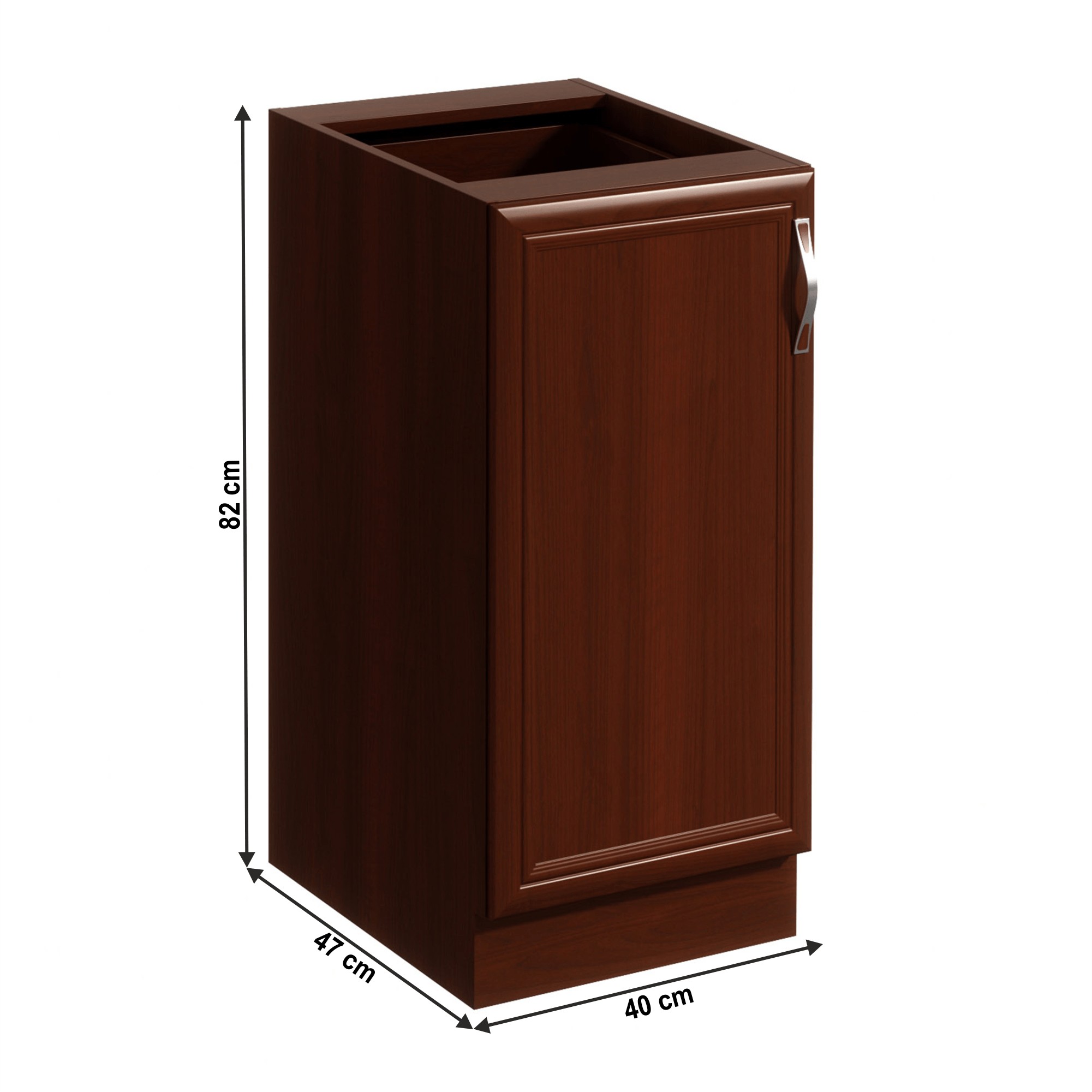 Rustikálna dolná kuchynská skrinka SICILIA D40 L je jednodverová skrinka, ktorá sa otvára pomocou plastovej úchytky. Vnútorný priestor je policou rozdelený na 2 odkladacie plochy. Ľavé prevedenie umožňuje otváranie dvierok do ľavej strany. Skrinka je na výber aj v pravom prevedení. Systém Sicilia je sektorová kuchynská zostava vyrobená v rustikálnom štýle, ktorá vyniká moderným a kvalitným spracovaním. Jedinečnú krásu dotvárajú detaily na čelných plochách a ornamenty na okrasných lištách. Kuchyňa spĺňa požiadavky aj tých najnáročnejších klientov. Trendové prevedenie vnesie teplo do vašej kuchyne. Korpus a dvierka sú vyrobené z laminovanej DTD v prevedení orech Milano. Ozdobné lišty sú z kvalitnej MDF a podčiarkujú rustikálny nádych kuchynskej linky. Dvierka a zásuvky sa otvárajú pomocou plastových úchytiek. Dolné kuchynské skrinky sa dodávajú bez pracovnej dosky, ktorú je možné doobjednať vo farebnom prevedení royal beigemarble v hrúbke 2,8 cm. Z jednotlivých prvkov zostavy si môžete vyskladať kuchynskú linku podľa vašich potrieb a predstáv. Ak vám nevyhovuje farba, je možné si vybrať komponenty aj v svetlom prevedení biela / sosna Andersen.