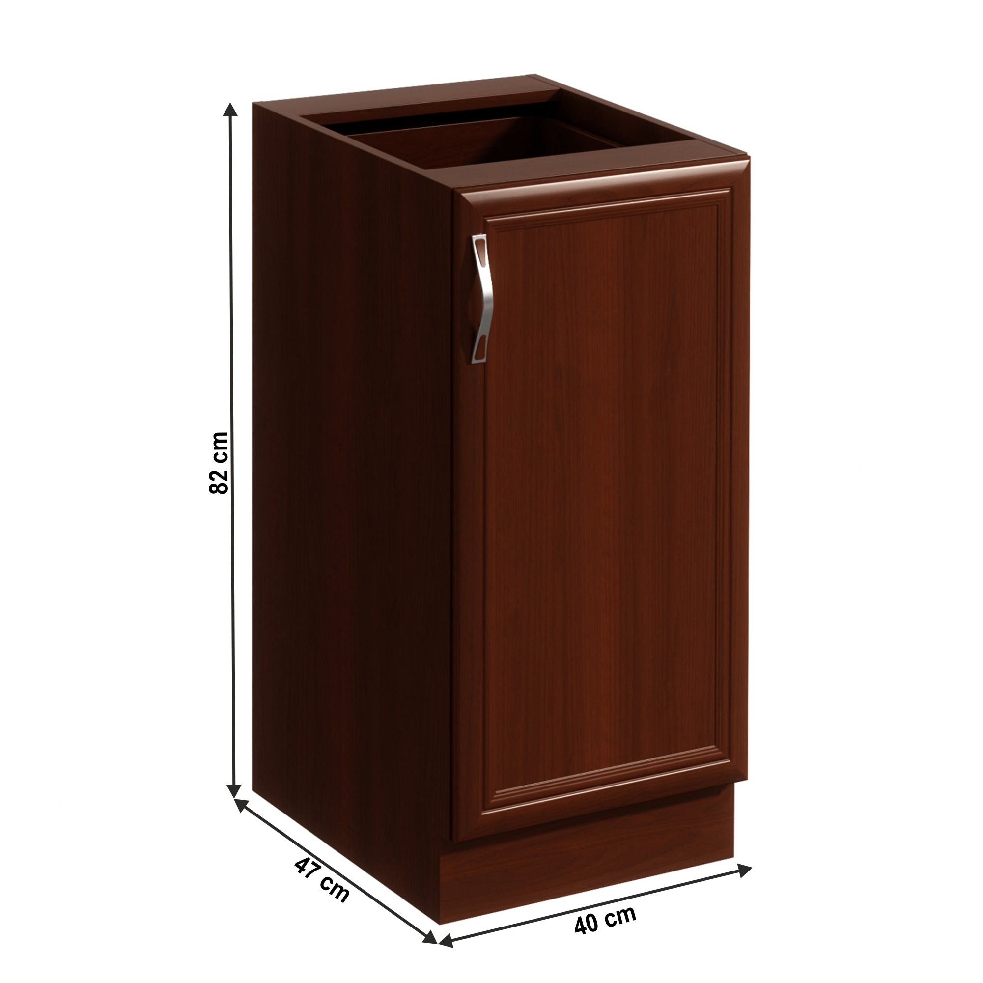 Rustikálna dolná kuchynská skrinka SICILIA D40 P je jednodverová skrinka, ktorá sa otvára pomocou plastovej úchytky. Vnútorný priestor je policou rozdelený na 2 odkladacie plochy. Pravé prevedenie umožňuje otváranie dvierok do pravej strany. Systém Sicilia je sektorová kuchynská zostava vyrobená v rustikálnom štýle, ktorá vyniká moderným a kvalitným spracovaním. Jedinečnú krásu dotvárajú detaily na čelných plochách a ornamenty na okrasných lištách. Kuchyňa spĺňa požiadavky aj tých najnáročnejších klientov. Trendové prevedenie vnesie teplo do vašej kuchyne. Korpus a dvierka sú vyrobené z laminovanej DTD v prevedení orech Milano. Ozdobné lišty sú z kvalitnej MDF a podčiarkujú rustikálny nádych kuchynskej linky. Dvierka a zásuvky sa otvárajú pomocou plastových úchytiek. Dolné kuchynské skrinky sa dodávajú bez pracovnej dosky, ktorú je možné doobjednať vo farebnom prevedení royal beigemarble v hrúbke 2,8 cm. Z jednotlivých prvkov zostavy si môžete vyskladať kuchynskú linku podľa vašich potrieb a predstáv. Ak vám nevyhovuje farba, je možné si vybrať komponenty aj v svetlom prevedení biela / sosna Andersen.