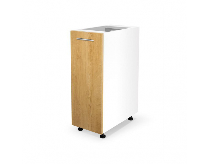 Dolná kuchynská skrinka VENTO D-30/82 je jednodverová skrinka, ktorú možno kombinovať s ostatnými prvkami z modelovej rady Vento. Rozmery skrinky sú (ŠxHxV): 30x52x82 cm. Korpus skrinky je vyrobený vo farbe biela a fronty v prevedení dub medový. Ak vám nevyhovuje farba, je možné si vybrať aj z iných farebných prevedení. Z jednotlivých skriniek Vento si môžete vyskladať sektorovú zostavu podľa vašich potrieb a predstáv. Korpus skriniek je vyrobený z laminovanej DTD s hrúbkou 16 mm a fronty z MDF. Skrinky sa dodávajú s vodorovnými úchytkami. V cene dolných skriniek nie je zahrnutý sokel, pracovná doska ani drez.