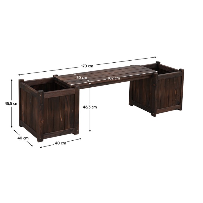 Lavička s kvetináčmi SASIL predstavuje štýlové a praktické riešenie pre každého, kto chce spojiť pohodlné sedenie s prírodným prvkom. Je vyrobená z kvalitného jedľového dreva v hnedom farebnom prevedení, vďaka čomu pôsobí prirodzene, hrejivo a zároveň elegantne. S celkovými rozmermi (ŠxHxV): 170x40x46,3 cm ponúka dostatok priestoru na komfortné sedenie - výška sedu je 46,3 cm, hĺbka 30 cm a šírka 102 cm, pričom jej nosnosť dosahuje až 180 kg. Súčasťou lavičky sú dva integrované kvetináče s rozmermi (ŠxHxV): 40x40x45,5 cm a vnútorným priestorom (ŠxHxV): 35x36x36 cm. Každý z nich má objem 45 litrov, čo poskytuje dostatok miesta pre kvety či menšie okrasné dreviny. Vďaka nim lavička vytvára príjemnú atmosféru a stáva sa nielen funkčným, ale aj výrazným dekoratívnym prvkom. Je ideálna na záhradu, terasu aj do verejných exteriérov. Svojím vidieckym štýlom prirodzene zapadne do moderného aj rustikálneho prostredia a priestoru dodá teplo prírodného dreva i sviežosť zelene. Lavička je odolná voči poveternostným podmienkam, no pre zachovanie jej dlhej životnosti sa odporúča chrániť ju pred nepriaznivým počasím. Dodáva sa v demonte.
