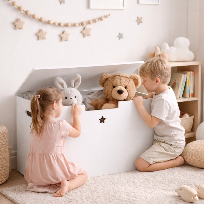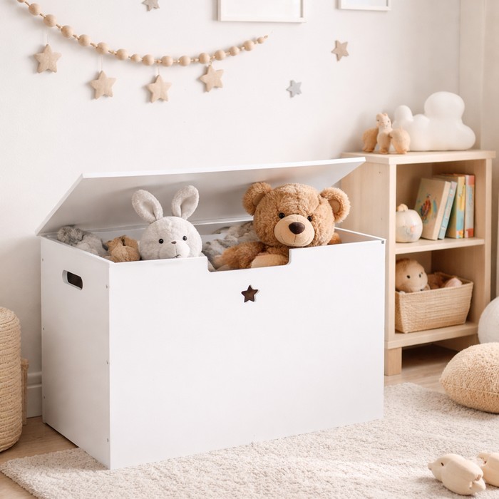 Viacúčelový drevený box BOLIS je praktický a zároveň štýlový doplnok do detskej izby. Je vyrobený z kombinácie masívneho borovicového dreva a MDF, pričom jeho biele prevedenie sa ľahko zladí s rôznymi typmi interiéru. Ponúka dostatok priestoru na uloženie hračiek, kníh, školských potrieb či sezónnych prikrývok, čím pomáha udržiavať poriadok a zlepšuje organizáciu v miestnosti. Rozmery boxu sú (ŠxHxV): 60x38x42 cm, jeho maximálna nosnosť je 50 kg a hmotnosť dosahuje 8,8 kg. Hrúbka použitého materiálu je 1 cm, čo prispieva k jeho stabilite a odolnosti. Praktické sklápateľné veko s výrezmi po bokoch umožňuje jednoduché otváranie aj pohodlné premiestňovanie. Box je multifunkčný pomocník vhodný najmä do detských izieb, kde pomáha udržiavať veci prehľadne uložené. Spĺňa európske bezpečnostné normy EN 71, takže je bezpečný pre používanie, avšak nie je vhodný pre deti do 3 rokov. Produkt sa dodáva v demonte a je určený na jednoduchú montáž.