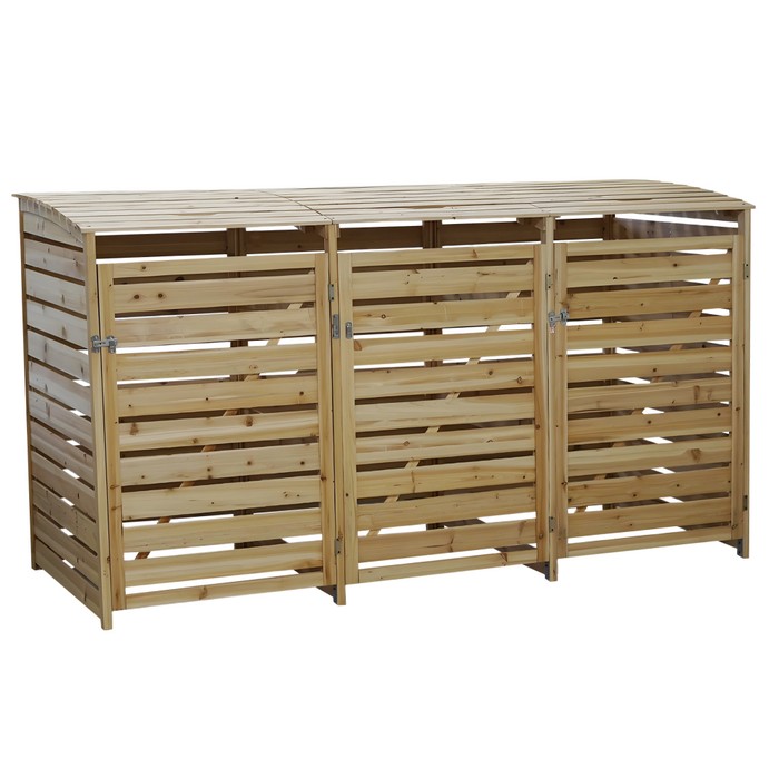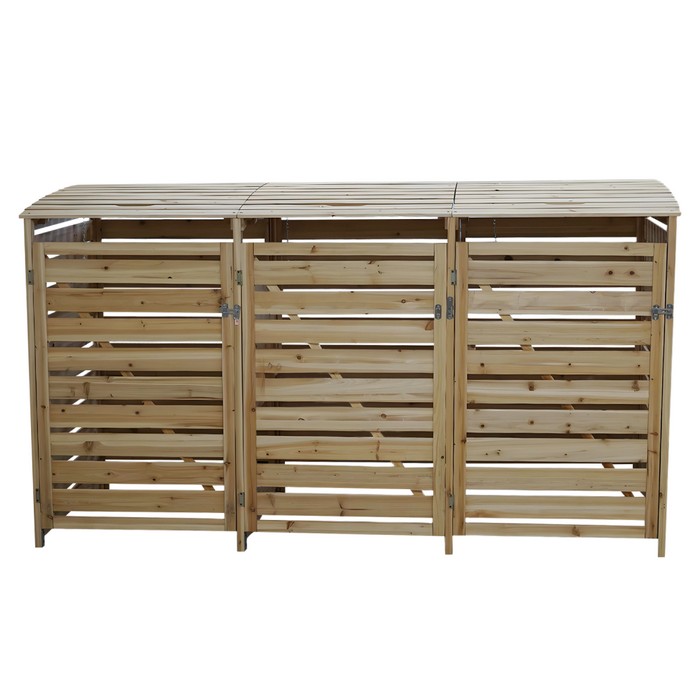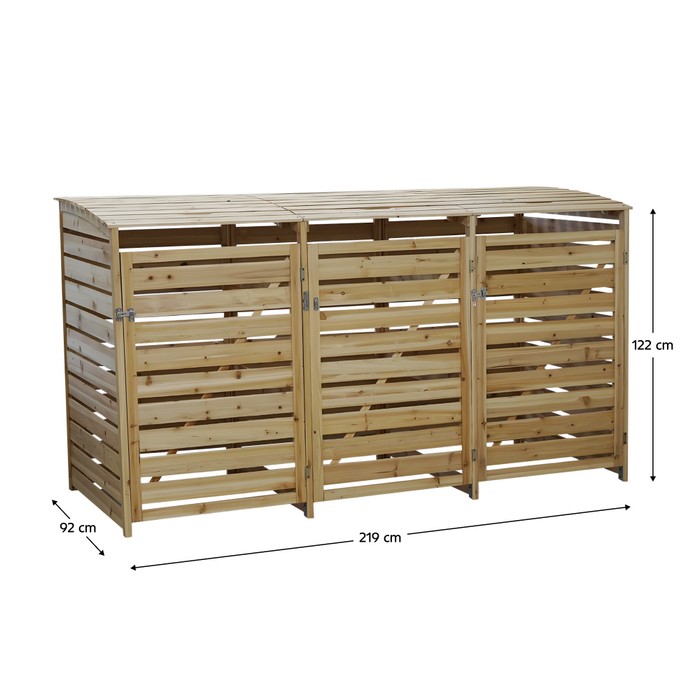 Drevený box na odpadkové koše BRUDO TYP 2 predstavuje praktické a estetické riešenie pre zakrytie odpadových nádob a udržanie poriadku v exteriéri. Je vyrobený z kvalitného jedľového dreva v prírodnej farbe, pričom hrúbka materiálu 2,5 cm zabezpečuje pevnosť, stabilitu a dlhú životnosť. Celkové rozmery boxu sú (ŠxHxV): 219x92x122 cm, vďaka čomu poskytuje dostatok priestoru na uloženie troch odpadkových košov. Je vhodný pre tri koše s maximálnym objemom 240 litrov, pričom odporúčaný rozmer jedného koša je (ŠxHxV): 74x74x106 cm. Je vybavený horným výklopným vekom, ku ktorému sú pripojené tri reťaze určené na uchytenie k vekám odpadkových košov, čo umožňuje ich súčasné otváranie a výrazne uľahčuje vkladanie odpadu aj jeho vyberanie bez zbytočnej manipulácie. Na prednej strane sa nachádzajú praktické dvierka so zámkom, ktoré zvyšujú bezpečnosť a stabilitu uložených nádob a zároveň zabezpečujú jednoduchý prístup ku košom. Medzery medzi drevenými lamelami umožňujú prirodzené odvetrávanie, čím sa minimalizuje hromadenie pachov a vlhkosti vo vnútri boxu. Box spoľahlivo chráni odpadkové koše pred nepriaznivým počasím, vetrom aj zvieratami, pričom zároveň prispieva k upravenému vzhľadu záhrady, dvora alebo priestoru pred domom. Výrobok je praktický, dodávaný v demonte a pre zachovanie jeho kvality a predĺženie životnosti sa odporúča chrániť ho pred nepriaznivými poveternostnými podmienkami.