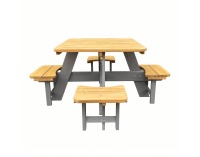 Set je vyrobený z kvalitného masívneho dreva, čo zaručuje jeho dlhú životnosť a odolnosť voči poveternostným podmienkam. Vďaka svetlej farebnosti sa ľahko začlení do akéhokoľvek exteriéru a dodá mu príjemnú atmosféru. S rozmermi 106 cm na šírku, 106 cm na hĺbku a výškou 51 cm ponúka dostatok priestoru pre štyri deti, aby si mohli užívať spoločné chvíle pri hre alebo občerstvení.