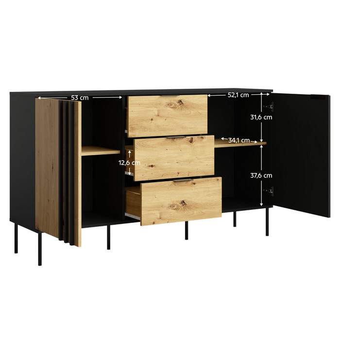 Dvojdverová komoda RIMINA 2D3S vyniká moderným dizajnom a praktickým úložným priestorom. Vyrobená je z kvalitnej DTD a laminovanej MDF v štýlovej kombinácii čierna onyx / dub artisan, ktorá vnesie do interiéru eleganciu a teplo prírodného dreva. Komoda ponúka dve skrinky a tri priestranné zásuvky, vďaka čomu poskytuje dostatok miesta na oblečenie, dokumenty či doplnky. Za dvierkami sa nachádza polica, ktorá rozdeľuje priestor na dve praktické odkladacie plochy. Rozmery komody sú (ŠxHxV): 165,1x40x92 cm, hrúbka materiálu 1,6 cm. Nosnosť vrchnej dosky je 20 kg, zásuvky 7 kg a police 5 kg. Komoda stojí na kovových nožičkách v čiernej farbe s výškou 18 cm, ktoré zabezpečujú stabilitu a opticky odľahčujú vzhľad nábytku. Doplnená je o plastové úchytky v čiernom prevedení a dekoratívne dvierka, ktoré podčiarkujú jej moderný štýl. Pre väčšiu bezpečnosť odporúčame komodu pripevniť k stene. Dodávané v demonte.