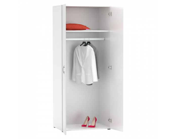 Dvojdverová šatníková skriňa Ramsa 2 je praktický a elegantný kus nábytku, ktorý ponúka dostatok úložného priestoru. Vďaka bielemu prevedeniu sa ľahko hodí do rôznych interiérov. Vyrobená je z aglomerovaného materiálu – laminovanej DTD. Pozostáva z police, ktorá sa nachádza v hornej časti skrine a prakticky poslúži na odkladanie rôznych vecí. V strede skrine sa nachádza vešiaková časť, ktorá sa postará o organizáciu vášho oblečenia. Manipuláciu s dverami zabezpečujú úchytky v striebornom prevedení. Stabilita je zabezpečená vďaka plastovým klzákom. Celkové rozmery skrine sú (ŠxHxV): 74×51,6×179 cm. Hrúbka materiálu je 1,6 cm, nosnosť police je 5 kg a nosnosť vešiakovej tyče je 12 kg.