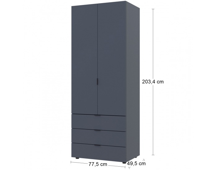 Skriňa má dve dvere a tri zásuvky, čo poskytuje dostatok úložného priestoru pre vaše oblečenie alebo iné predmety. Jej farebné prevedenie je sivé s tmavou svetlosťou farby. Skriňa neobsahuje osvetlenie ani funkciu pomalého zatvárania.