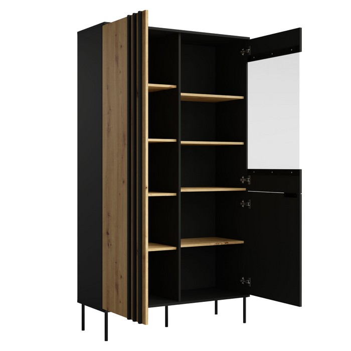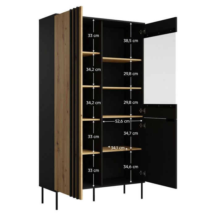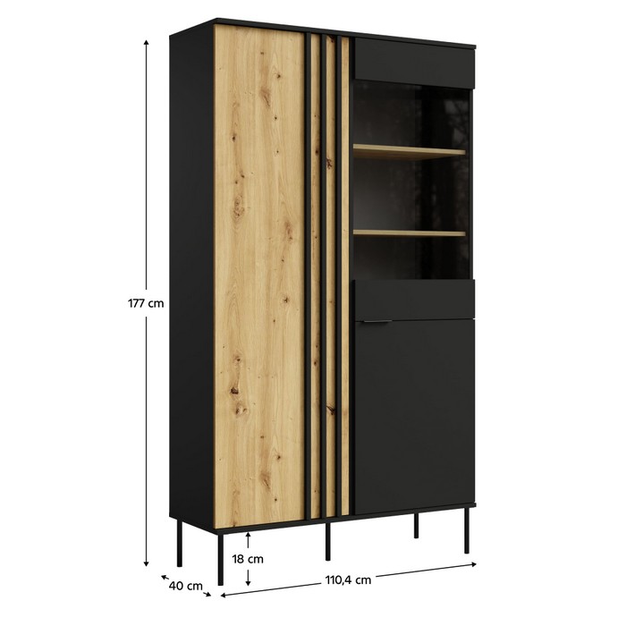 Dvojdverová vitrína RIMINA 2D vyniká moderným dizajnom a praktickým riešením úložného priestoru. Vyrobená je z kvalitnej DTD a laminovanej MDF v atraktívnom farebnom prevedení čierna onyx / dub artisan, doplnenom o tvrdené sklo s hrúbkou 0,4 cm. Vitrína ponúka dve skrinky s policovým úložným priestorom - časť je ukrytá za plnými dvierkami a časť za dvierkami so sklenenou výplňou, ktoré umožňujú vystaviť dekorácie, knihy alebo porcelán. Rozmery vitríny sú (ŠxHxV): 110,5x40x195 cm, hrúbka materiálu je 1,6 cm. Nosnosť jednej police je 5 kg. Stabilitu zabezpečujú kovové nožičky v čiernej farbe s výškou 18 cm, ktoré dodávajú vitríne ľahkosť a eleganciu. Dvierka sú doplnené o plastové úchytky v čiernom prevedení a dekoratívne prvky, ktoré podčiarkujú jej moderný štýl. Pre väčšiu bezpečnosť odporúčame vitrínu pripevniť k stene. Dodávané v demonte.