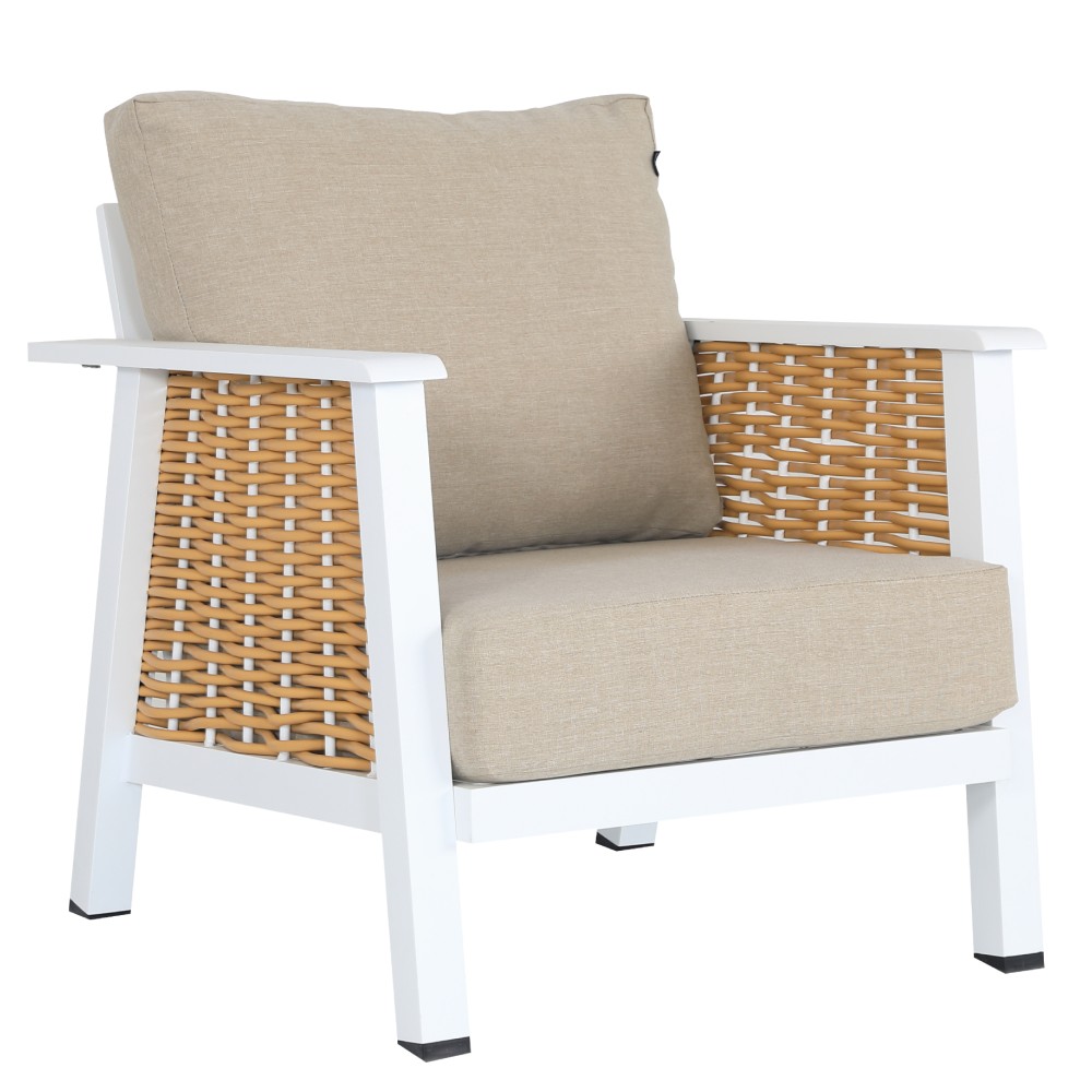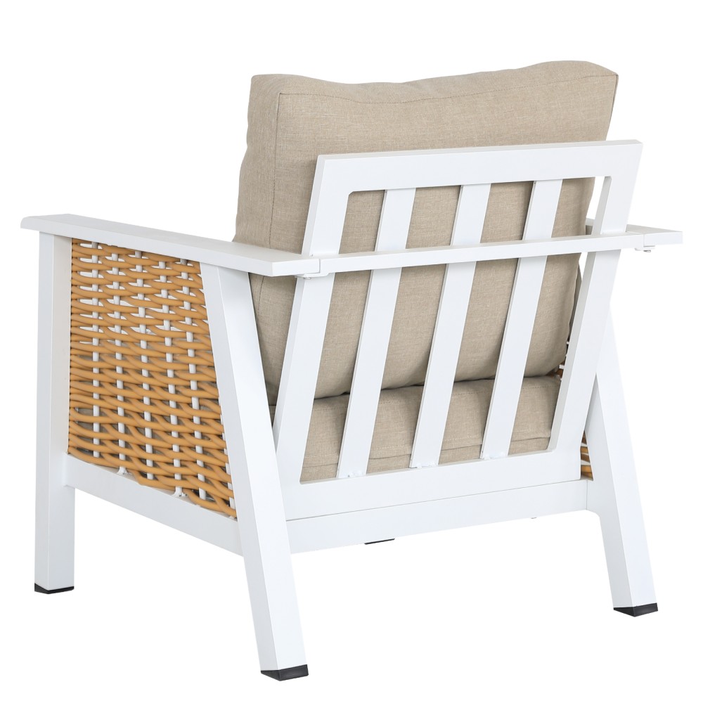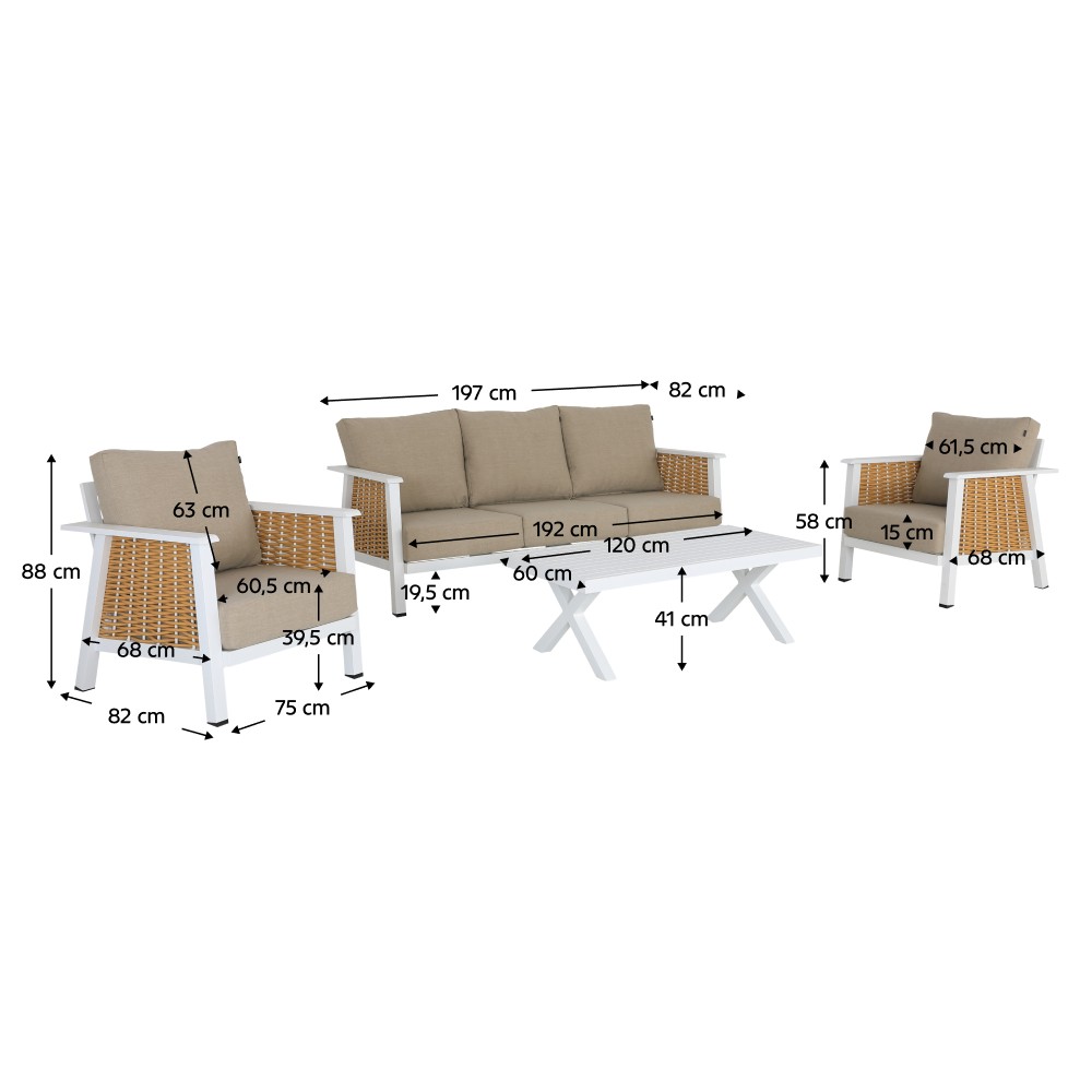 Zútulnite si svoju terasu či záhradu týmto štýlovým záhradným nábytkom BABAK v elegantnej kombinácii svetlohnedej, hnedej a bielej farbe. Set pozostáva z priestrannej trojmiestnej pohovky, dvoch pohodlných kresiel a praktického stolíka s moderným x-rámom. Vďaka kvalitnej hliníkovej konštrukcii doplnenej o umelý ratan získate vzhľad luxusu bez náročnej údržby. Ideálny pre letné grilovačky, rodinné stretnutia, či chvíle oddychu na čerstvom vzduchu. Celkové rozmery trojsedu sú (ŠxHxV): 197x82x88 cm, rozmery kresla (ŠxHxV): 75x82x88 cm a rozmery stola sú (ŠxHxV): 120x60x41 cm. Výška sedu je 39,5 cm, hĺbka sedu 47 cm. Maximálna nosnosť na osobu je 100 kg a nosnosť stolíka 40 kg. Súčasťou sú aj vankúše so zipsom s hrúbkou 15/20 cm. Sú snímateľné a vodeodolné s možnosťou prať pri teplote 30°C. Dodávané v demonte.