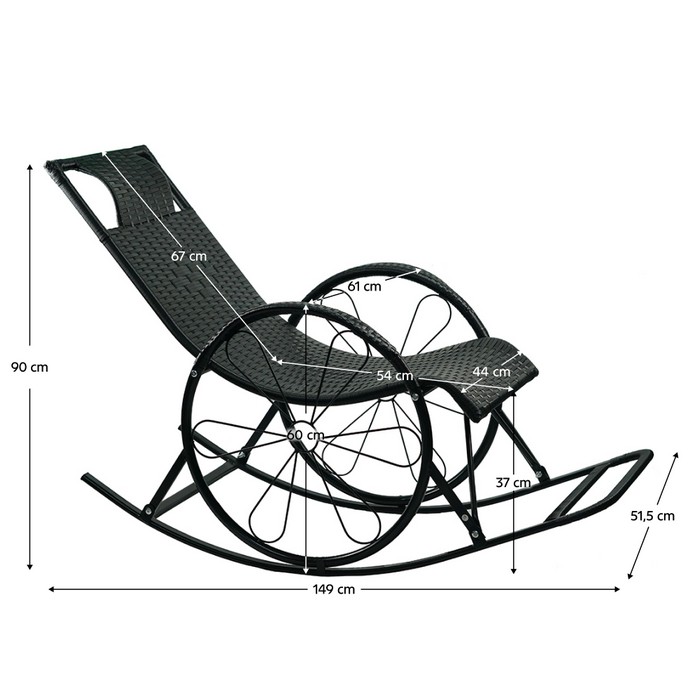 Hojdacie kreslo ROKIN prináša dokonalé pohodlie a jemné hojdanie, či už sa ponárate do obľúbenej knihy, relaxujete po náročnom dni alebo si jednoducho vychutnávate chvíle pokoja. Je vyrobené z kvalitného technického ratanu a kovovej konštrukcie v elegantnej čiernej farbe, ktorá zaručuje pevnosť, stabilitu a dlhú životnosť. Minimalistický dizajn a pohodlné podrúčky v tvare kolesa umožňujú komfortný relax pri každom použití. Kreslo má celkové rozmery (ŠxHxV): 51,5x149x90 cm a poskytuje pohodlný sed s výškou 37 cm, hĺbkou 54 cm a šírkou 44 cm. Chrbtová opierka má šírku 44 cm a výšku 67 cm, zatiaľ čo výška opierky na ruku od zeme je 60 cm. Nosnosť kresla je maximálne 120 kg, takže je vhodné na každodenné použitie. Hojdacie kreslo je ideálne do interiéru alebo na kryté terasy. Pre predĺženie životnosti odporúčame chrániť ho pred nepriaznivými poveternostnými podmienkami. Kreslo je dodávané v demonte, čo umožňuje jednoduchú prepravu a rýchlu montáž.