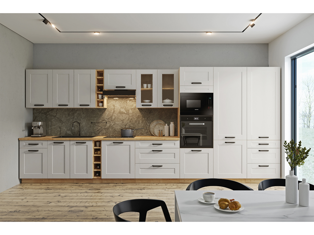 Dizajn skrinky Lula je navrhnutý tak, aby sa hodil do rôznych interiérových štýlov. Svetlá farebná kombinácia bielej a dubu dodáva miestnosti svieži a moderný vzhľad. Skrinka je určená na vertikálne umiestnenie hore, čo umožňuje efektívne využitie priestoru v kuchyni.