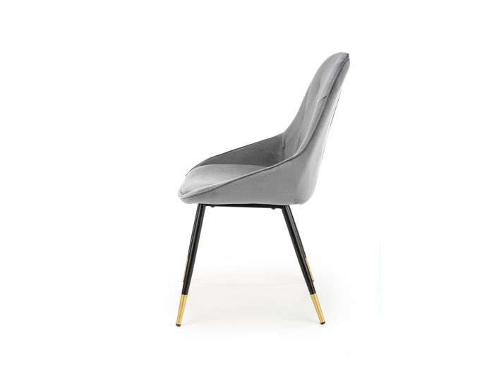 Štýlová jedálenská stolička K437 rozžiari kuchyňu či jedáleň a očarí každú Vašu návštevu. Dizajn stoličky je povýšený zaujímavým prešívaním operadla, mäkkým sedákom a zlatými koncami nožičiek. Vďaka jej prevedeniu je možné ju umiestniť do moderne zariadenej jedálne či kuchyne, no svoje uplatnenie si nájde aj v kanceláriách alebo v spálni ako stolička k toaletnému stolíku. Sedadlo aj operadlo sú čalúnené kvalitnou, zamatovou látkou sivej farby a nožičky sú z práškovo lakovanej ocele čiernej farby. Jej rozmery sú (ŠxHxV): 49x55x88 cm a výška sedu je 47 cm. Dodávaná je v demonte.