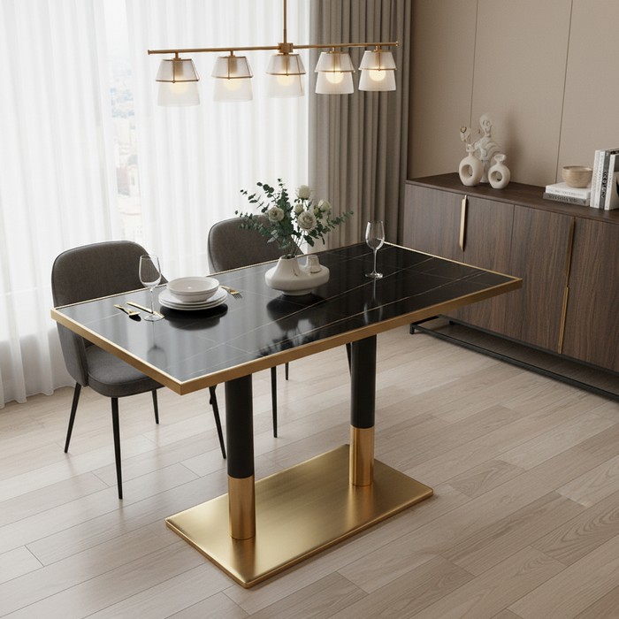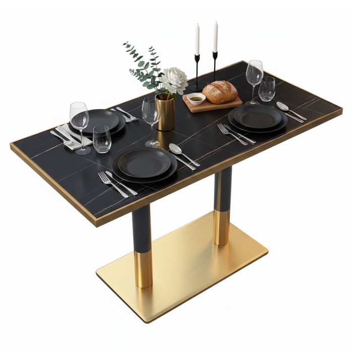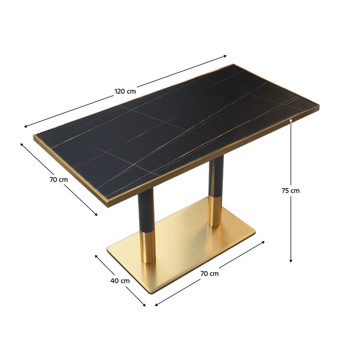 Jedálenský bistro stôl DARIAN je elegantným doplnkom moderných interiérov, kde sa spája štýlový dizajn s praktickým využitím. Vrchná doska vo farebnom prevedení čierny mramor v kombinácii s čiernymi nožičkami a zlatou kovovou podstavou vytvára luxusný a nadčasový vzhľad. Tento kontrast farieb pôsobí veľmi vkusne a dokáže oživiť interiér kaviarne, bistra aj modernej domácnosti. Doska stola je vyrobená z kvalitného akrylového materiálu s dekorom bieleho mramoru, ktorý verne napodobňuje vzhľad prírodného kameňa. Zároveň ponúka vyššiu odolnosť a jednoduchú údržbu. Hladký povrch je príjemný na dotyk a ľahko sa čistí, čo oceníte pri každodennom používaní. Stabilitu zabezpečuje pevná kovová konštrukcia s podstavou v zlatom prevedení, ktorá dodáva stolu exkluzívny charakter. Stôl má rozmery (ŠxHxV): 120x70x75 cm a hrúbka materiálu dosky sa pohybuje od 1,1 do 3 cm. Kovová podstava má rozmery 70x40 cm a zabezpečuje dobrú stabilitu. Nosnosť stola je 110 kg. Bistro stôl má obdĺžnikový tvar a je ideálnou voľbou do bistier, kaviarní alebo moderných interiérov, kde vytvorí príjemné miesto na stolovanie či stretnutia pri káve. Dodáva sa v demonte.