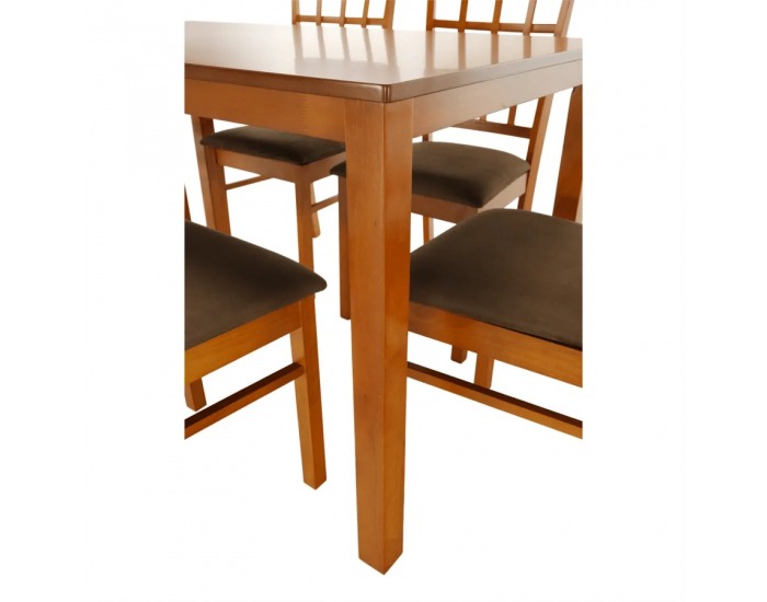 Jedálenský komplet GRID 1+6 NEW bude Vašim verným spoločníkom pri vychutnávaní každého jedla. Je moderný a do miestnosti vnáša eleganciu. Set sa skladá zo šiestich stoličiek a jedného stola. Rozmery stoličky sú (ŠxHxV): 44x48x90 cm a stola (ŠxHxV): 135x80x74 cm. Výška sedu na stoličke je 43 cm. Maximálna odporúčaná nosnosť stoličky je 110 kg. Set je vyrobený z dreva v odtieni čerešňa, pričom plát stola je z dyhovanej MDF (drevovláknitá doska). Mäkké stoličky zabezpečujúce pohodlie sú čalúnené béžovohnedou látkou. Moderný komplet, ktorý vytýči elegantný tón vo vašej domácnosti je dodávaný v demonte, čo znamená, že je potrebné ho poskladať.