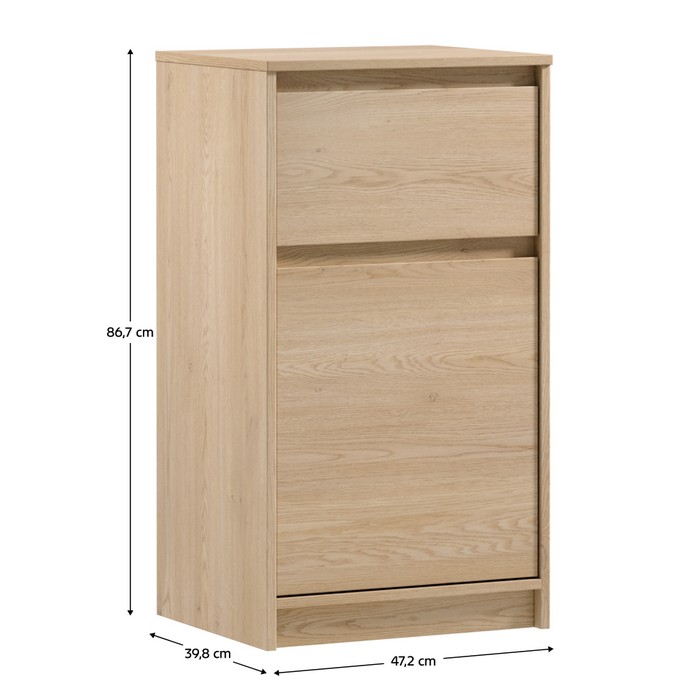 Elegantná komoda MANOL K1D1S spája moderný dizajn s praktickým využitím a je ideálnym doplnkom do obývačky, spálne či predsiene. Vyrobená je z laminovanej drevotrieskovej dosky (DTD) s ABS hranami a zadnou časťou z HDF sololitu, vďaka čomu je odolná a spoľahlivá. Komoda má rozmery (ŠxHxV): 47,2x39,8x86,7 cm a hrúbku materiálu 1,5 cm, čo zaručuje stabilitu aj pri každodennom používaní. Vďaka jednodverovej konštrukcii ponúka praktický úložný priestor s jednou policou a šuplíkom, ktoré unesú až 5 kg. Vrch komody má nosnosť 10 kg, takže na ňu pohodlne umiestniš dekorácie či doplnky. Bezúchytkové čelá so skrytým zrezaním podčiarkujú elegantné línie a minimalistický vzhľad. Dvierka sú univerzálne, môžeš ich teda namontovať na pravú alebo ľavú stranu podľa potreby. Kvalitné guľôčkové ložiská GTV a pevné pánty zabezpečujú plynulý chod zásuvky aj dvierok. Komoda stojí na plastových nožičkách, ktoré chránia podlahu a uľahčujú manipuláciu. Moderný dizajn v odtieni cremona prináša do interiéru teplý, prírodný tón, ktorý sa ľahko kombinuje s iným nábytkom. Pre väčšiu stabilitu sa odporúča komodu pripevniť k stene. Dodáva sa v demonte, s jednoduchým a prehľadným návodom na montáž.