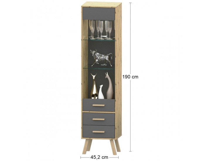 Jednodverová vitrína VILANDER 1D2DR je veľmi pekný moderný kus nábytku, ktorý vyzdvihne krásu všetkých Vašich obľúbených dekoratívnych predmetov. Navyše disponuje s dvoma menšími zásuvkami, v ktorých sa nájde dostatok miesta na všetky dôležité dokumenty, ktoré potrebujete mať starostlivo uložené a v prípade potreby poruke. Rozmery vitríny sú (ŠxHxV): 45,2x40x190 cm. Nechajte sa zlákať príjemným pocitom teplého domova v modernom a vzdušnom štýle. Kolekcia Vilander sa postará o zážitok pri každej návšteve priestoru, ktorý obdaríte jej prítomnosťou. Využiteľnosť kompaktnosti a funkčnosti sa stretáva s ďalšími pozitívnymi vlastnosťami, ktorými nádherná kolekcia nábytku oplýva. Mimoriadne moderný minimalistický vzhľad v podobe prevedenia korpusu nábytku vo farbe dub artisan, je doplnený elegantnými dvierkami vo farbe sivý grafit. Úplnú jednoduchosť nábytku však vkusne rozbíjajú decentné úchytky a nožičky, ktoré v celku dodávajú šmrnc kolekcii Vilander. Nábytok je vyrobený z kvalitnej DTD a doplnený systémom vysoko kvalitných upevňovacích závesov s ľahko použiteľnými teleskopickými lištami na zásuvky. Z jednotlivých dokonalých prvkov kolekcie Vilander si efektívne zariadite priestrannú oddychovú zónu, ale aj malú útulnú izbičku, kde uľavíte každej romantickej duši.