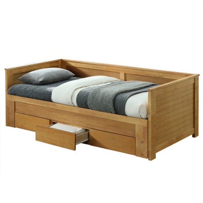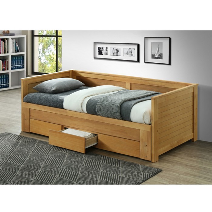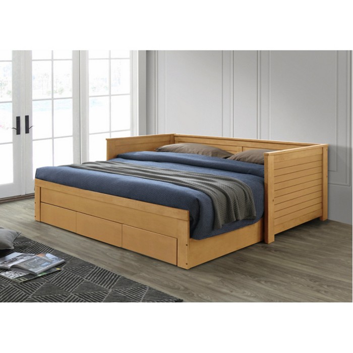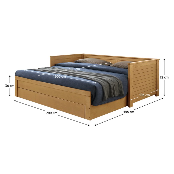 Masívne drevo je obľúbené pre svoju prirodzenú kresbu, pevnosť a dlhú životnosť. Posteľ GORETA spája výhody viacerých kusov nábytku do jedného praktického riešenia, ktoré je ideálne najmä do menších interiérov. Počas dňa môže slúžiť ako pohodlná pohovka, v noci sa jednoducho premení na plnohodnotné lôžko. Základný rozmer jednolôžka 97x200 cm je možné rozložiť na priestrannú plochu na spanie s rozmerom 180x200 cm, čím vytvoríte komfortné miesto aj pre návštevu. Celkové rozmery postele sú (ŠxHxV): 209x103x72 cm a hĺbka po rozložení dosahuje 186 cm. Konštrukcia je vyrobená z kombinácie masívneho dreva a MDF, pričom dubové farebné prevedenie pôsobí moderne a ľahko sa kombinuje s ostatným zariadením. Stabilitu pri rozkladaní zabezpečuje vysúvacia časť na kolieskach, ktorá umožňuje jednoduchú manipuláciu. Praktická bočná zástena nahrádza čelo postele a poskytuje pohodlnú oporu pri sedení aj pri použití dekoratívnych vankúšov. Úložný priestor tvorí trojica šuplíkov, ktoré sú vhodné na posteľnú bielizeň alebo ďalšie potrebné veci. Posteľ sa dodáva s dvoma latkovými roštmi, pričom výška po rošt je 36 cm. Nosnosť jednolôžka je 110 kg a po rozložení dosahuje 180 kg. Model sa dodáva bez matracov, pričom je možné vybrať si vhodné matrace z ponuky. Posteľ je dodávaná v demonte.