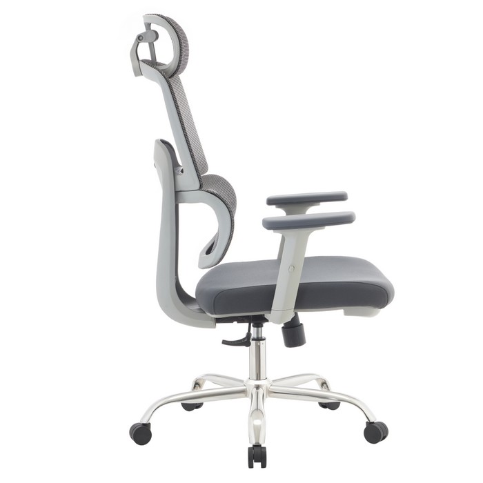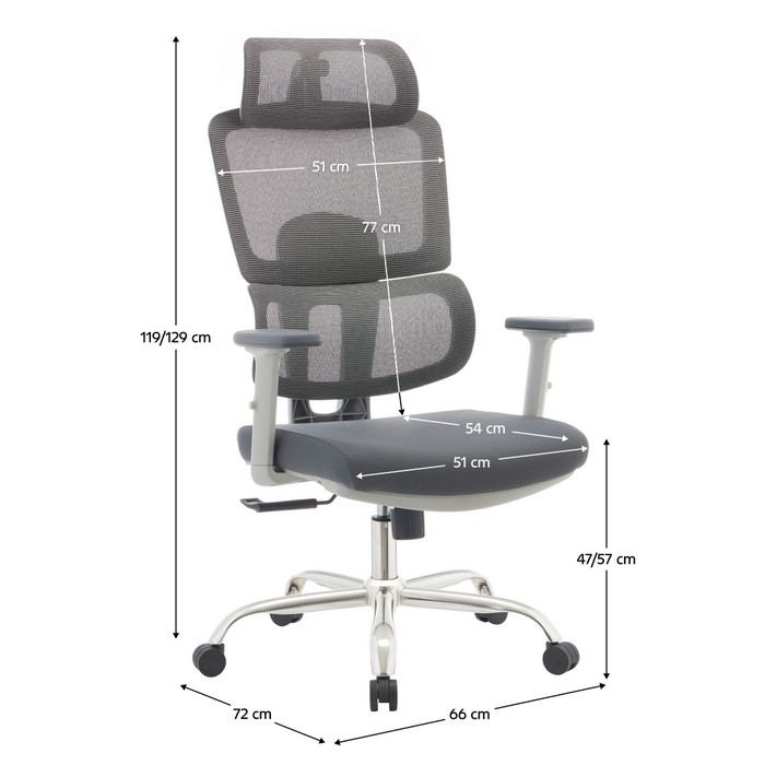 Kancelárske kreslo BYRON predstavuje spoľahlivé riešenie na každodennú prácu v kancelárii aj domácej pracovni. Vďaka rozmerom (ŠxHxV): 66x72x119-129 cm (ŠxHxV) ponúka dostatok priestoru a pohodlia aj počas dlhého sedenia. Výšku sedu si môžete nastaviť v rozmedzí 47 až 57 cm, takže sa jednoducho prispôsobí vašej postave aj výške pracovného stola. Vysoké operadlo so šírkou 51 cm a výškou 77 cm je vyhotovené zo sivej sieťoviny, ktorá zabezpečuje optimálnu cirkuláciu vzduchu. Ergonomicky tvarovaná bedrová časť poskytuje správnu oporu chrbtice a pomáha predchádzať únave. Nastaviteľná opierka hlavy umožňuje upraviť jej uhol podľa potreby a poskytuje pohodlnú podporu krku a šije. Sedák so šírkou 51 cm a hĺbkou 54 cm je čalúnený sivou látkou s oderuodolnosťou 80 000 cyklov podľa testu Martindale, zatiaľ čo sieťovina dosahuje až 90 000 cyklov, čo zaručuje dlhú životnosť materiálov. Výškovo nastaviteľné podrúčky pomáhajú stabilizovať ruky a ramená počas práce. Kreslo je otočné a vybavené mechanizmom hojdania, ktorý umožňuje uvoľnenie počas pracovného dňa. Stabilitu zabezpečuje pevná päťramenná chrómová podstava. Nosnosť kresla je až 150 kg. Zaujme moderným sivým prevedením v kombinácii s chrómovými prvkami, ponúka vysoký komfort a praktické funkcie. Dodáva sa v demonte.