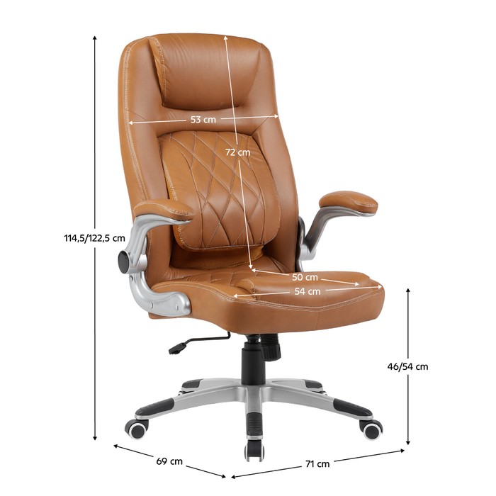 Kancelárske kreslo GREKO predstavuje ideálne spojenie komfortu, praktických funkcií a elegantného dizajnu. Hnedé čalúnenie z kvalitnej ekokože pôsobí moderne a vkusne, pričom materiál dosahuje odolnosť až 100 000 oderov podľa testu Martindale. V kombinácii so striebornou plastovou podstavou vytvára harmonický a nadčasový vzhľad vhodný do kancelárie aj domácej pracovne. Kreslo má rozmery (ŠxHxV): 71x69x114,5-122,5 cm a ponúka nastaviteľnú výšku sedu v rozmedzí 46–54 cm, takže sa jednoducho prispôsobí vašej postave aj výške pracovného stola. Sedadlo so šírkou 54 cm a hĺbkou 50 cm spolu s chrbtovou opierkou vysokou 72 cm a širokou 53 cm poskytujú dostatočný priestor na pohodlné sedenie. Nosnosť kresla je 150 kg. Je otočné a vybavené funkciou hojdania pre väčší komfort počas práce. Výsuvná bedrová časť opierky podporuje správne držanie tela a pomáha znižovať únavu pri dlhom sedení. Čalúnené opierky na ruky so sklopnou funkciou zvyšujú pohodlie a zároveň umožňujú praktické prispôsobenie priestoru. Univerzálne kolieska zabezpečujú plynulý pohyb po tvrdých aj mäkkých podlahách. Dodáva sa v demonte a je praktickou voľbou pre každodenné používanie.