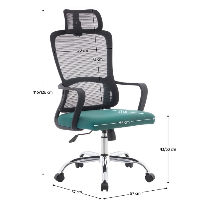 Kancelárske kreslo RANDY spája moderný vzhľad s vysokým komfortom, ktorý oceníte pri každodennej práci v kancelárii aj doma. Pri rozmeroch (ŠxHxV): 57x57x116-126 cm pôsobí kompaktne, no zároveň poskytuje dostatočný priestor na pohodlné sedenie. Výšku sedu je možné nastaviť v rozmedzí 43 až 53 cm, takže sa jednoducho prispôsobí vašim individuálnym potrebám. Vysoké operadlo so šírkou 50 cm a výškou 73 cm je doplnené o opierku hlavy, ktorá podporuje správne držanie tela a poskytuje oporu krčnej chrbtici. Chrbtová časť je vyhotovená z priedušnej sieťoviny s oderuodolnosťou 90 000 cyklov podľa testu Martindale, čo zabezpečuje výbornú cirkuláciu vzduchu. Sedák so šírkou 47 cm a hĺbkou 51 cm je čalúnený príjemnou látkou s oderuodolnosťou 80 000 cyklov, takže zvládne aj intenzívne používanie. Kreslo je otočné a vybavené mechanizmom hojdania pre väčšie pohodlie počas pracovného dňa. Stabilitu zabezpečuje pevná kovová podstava v chrómovom prevedení, doplnená o univerzálne kolieska vhodné na mäkké aj tvrdé podlahy. Plastové opierky na ruky prispievajú k správnej a pohodlnej polohe paží. Kombinácia čiernej, zelenej a chrómových prvkov pôsobí nadčasovo a elegantne. Prirodzene zapadne do kancelárie, pracovne aj domáceho pracovného priestoru. Nosnosť kresla je až 150 kg a dodáva sa v demonte.