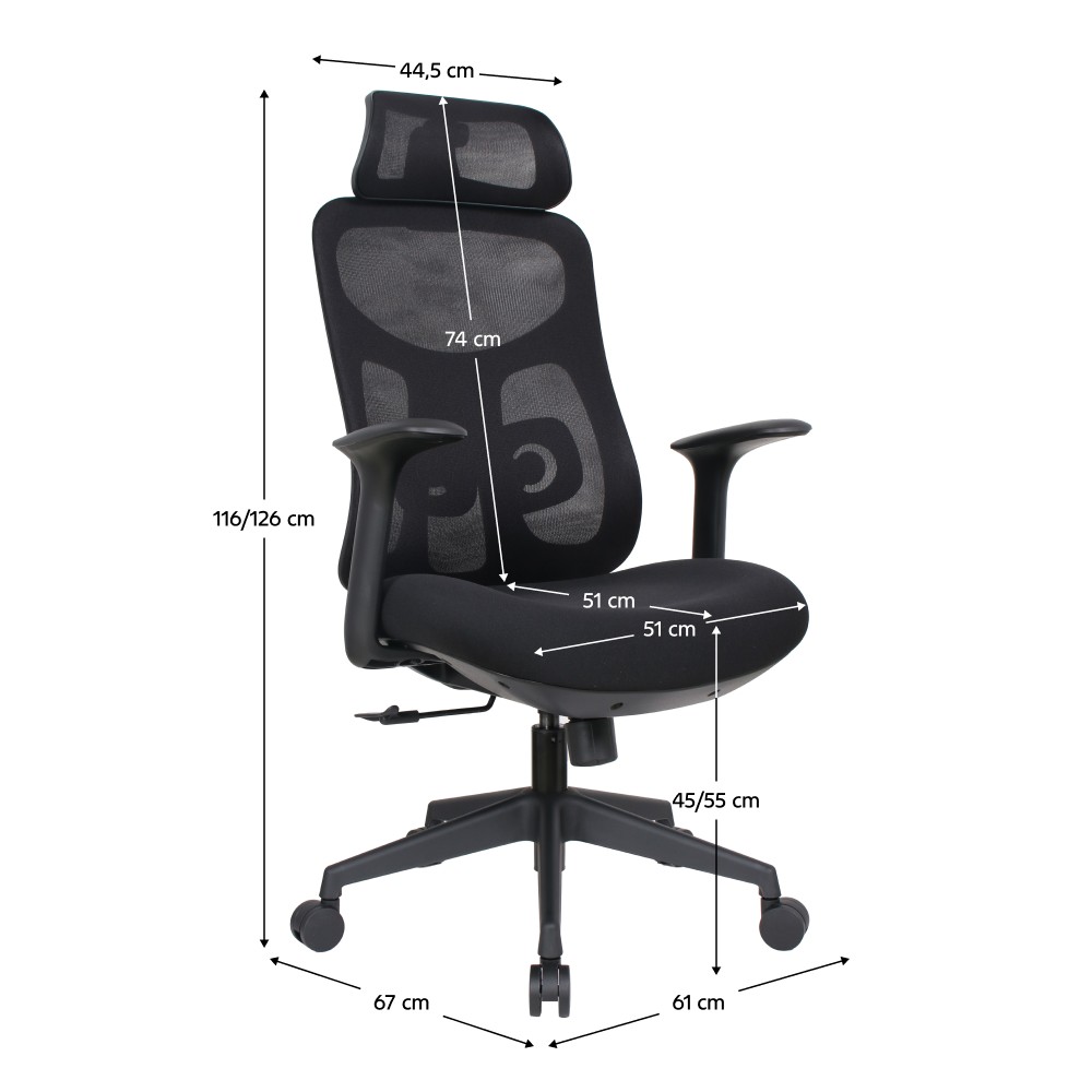 Doprajte si pohodlie a zdravé sedenie počas práce či štúdia s kancelárskou stoličkou SULIVAN, ktorá je navrhnutá s dôrazom na ergonómiu a komfort. O správnu oporu krku sa stará nastaviteľná opierka hlavy, zatiaľ čo ergonomická bedrová opierka s možnosťou nastavenia výšky poskytuje chrbtu presne takú podporu, akú potrebujete. Tvarované sedadlo so šírkou 51 cm a hĺbkou 51 cm spolu s opierkami na ruky zabezpečujú pohodlné sedenie aj pri dlhodobom používaní. Stolička umožňuje nastavenie výšky sedu v rozmedzí od 45 do 55 cm a je vybavená mechanizmom hojdania, ktorý podporuje prirodzený pohyb tela počas sedenia. Otočná konštrukcia zvyšuje flexibilitu pri práci a pevné vyhotovenie z kombinácie sieťoviny a plastu zaručuje dlhú životnosť, pričom oderuodolnosť textílie dosahuje až 90 000 cyklov podľa testu Martindale. Elegantná čierna farba dodáva stoličke moderný a univerzálny vzhľad. Celkové rozmery stoličky sú (ŠxHxV): 61x67x116-126 cm, chrbtová opierka má šírku 44,5 cm a výšku 74 cm, pričom nosnosť stoličky je až 150 kg. Stolička sa dodáva v demonte a vďaka premyslenému ergonomickému dizajnu sa stane spoľahlivým a pohodlným partnerom na každý pracovný deň.