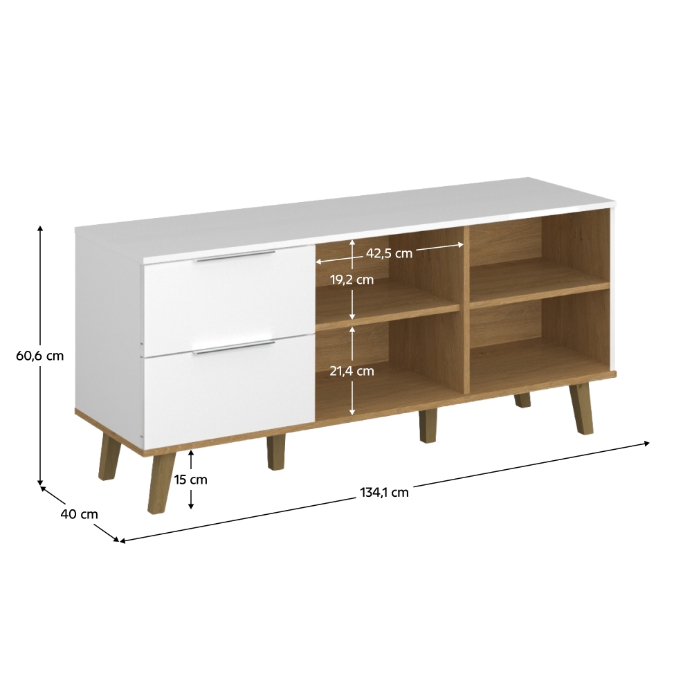 Vyrobená z kvalitného laminovaného DTD materiálu, komoda Nepu 2S/134 sa vyznačuje vysokou odolnosťou a dlhou životnosťou. Jej svetlé farebné prevedenie v kombinácii s dubom kamenným dodáva miestnosti svieži a moderný vzhľad. S rozmermi šírka 134,1 cm, výška 60,6 cm a hĺbka 40 cm sa ľahko zmestí do rôznych priestorov vášho domova.
