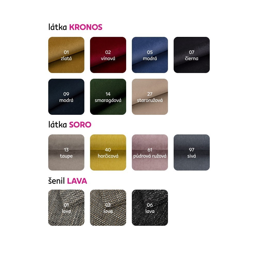 Možnosť objednať dvojkreslo CUBA aj v: mikrofáze za cenu 159 Eur ekokoži alebo v látke Lava v cene 189 Eur, cena v látke Savana alebo v látke Soro 179 Eur a v látke Kronos 179 Eur. Pri individuálnej objednávke je potrebné zaplatiť 20% zálohu z danej sumy. Po uhradení zálohy bude Vaša požiadavka zadaná do výroby. Doba dodania 8-10 týždňov.