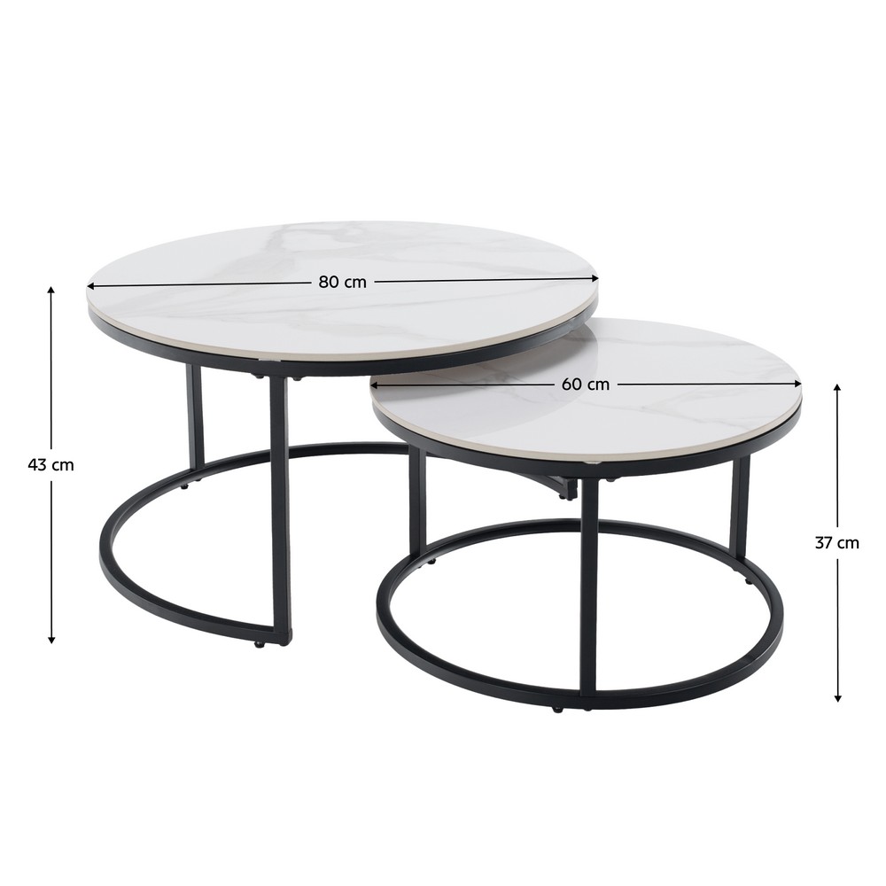 Konferenčný stolík Lastro v elegantnom prevedení bieleho mramoru a čiernej farby je ideálnym doplnkom pre moderné interiéry. Tento set obsahuje dva stolíky, ktoré sa vyznačujú okrúhlym tvarom a sú vyrobené z kvalitného brúseného kameňa a ocele. Vďaka svojmu dizajnu a farebnému prevedeniu sa hodia do rôznych typov obývacích priestorov, kde vytvoria štýlový akcent.