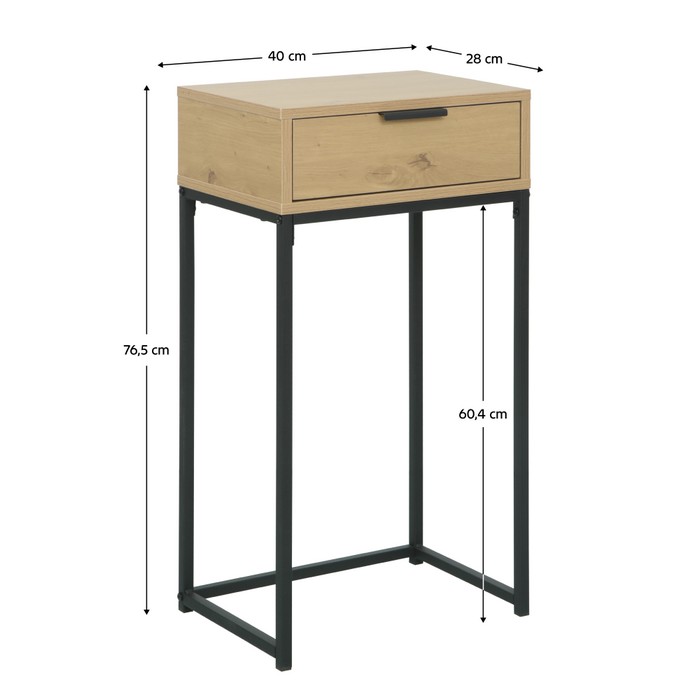 Konzolový stolík LERTOS prináša spojenie industriálneho štýlu, praktickosti a elegantného dizajnu. Vďaka kombinácii dekoru dub a čiernej farby pôsobí moderne a ľahko zapadne do predsiene, obývačky aj spálne, kde poslúži ako konzolový alebo nočný stolík. Stolík je vyrobený z melamínovej PB dosky s hrúbkou 1,2 - 1,5 cm v kombinácii s pevnou kovovou konštrukciou, ktorá zabezpečuje stabilitu a dlhú životnosť. Kompaktné rozmery (ŠxHxV): 40x28x76,5 cm z neho robia ideálne riešenie aj do menších priestorov, kde šetrí miesto bez straty funkčnosti. Disponuje jednou zásuvkou s nosnosťou 3 kg, vhodnou na odkladanie drobností, pričom vrchná doska unesie až 20 kg. Zásuvka je doplnená kovovou úchytkou v čiernej farbe. Stolík stojí na nožičkách a ponúka spodný priestor s výškou 60,4 cm, čo uľahčuje upratovanie aj opticky odľahčuje interiér. Pre vyššiu bezpečnosť odporúčame pripevnenie k stene. Dodávaný je v demonte.