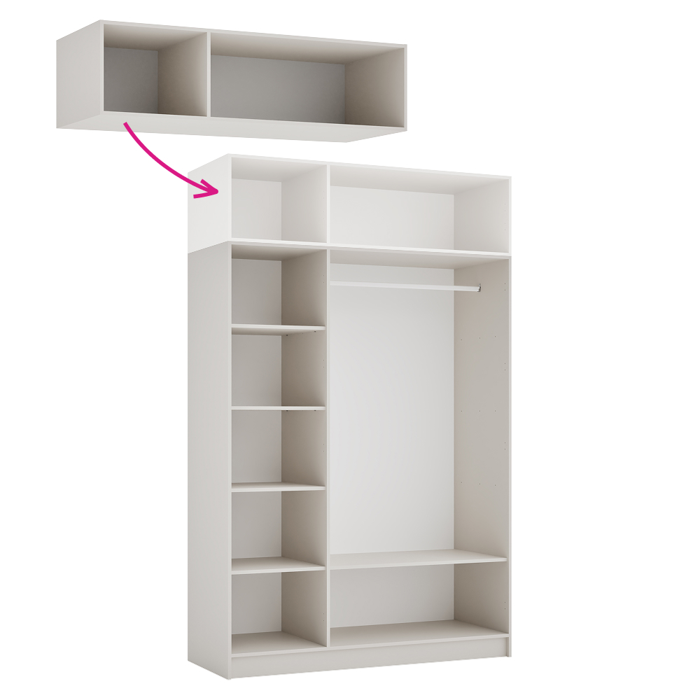Nadstavec skrine KREO 150 rozširuje úložný priestor a pomáha efektívne využiť miesto v hornej časti zostavy. Je vyrobený z laminovanej DTD s ABS hranami v dekore kašmír, pričom hrúbka DTD materiálu je 1,6 cm a ABS hrán 0,045 cm. Rozmery nadstavca sú (ŠxHxV): 150x58x40 cm a jeho maximálna nosnosť je 5 kg. Nadstavec je otvorený a je možné ho farebne kombinovať aj s odtieňom dub artisan. Dodáva sa samostatne, bez skrine, a odporúča sa ho použiť ku korpusu Kreo 150. Pre uzavretie a jednotný vzhľad ho možno doplniť o tri vysoké dvierka systému Kreo, ktoré sú dostupné v plnom prevedení alebo so zrkadlom. Predvŕtané otvory pre montáž pántov na oboch stranách umožňujú flexibilnú montáž. Pre vyššiu stabilitu odporúčame nadstavec pripevniť k stene. Produkt sa dodáva v demonte, čo uľahčuje prepravu a manipuláciu.