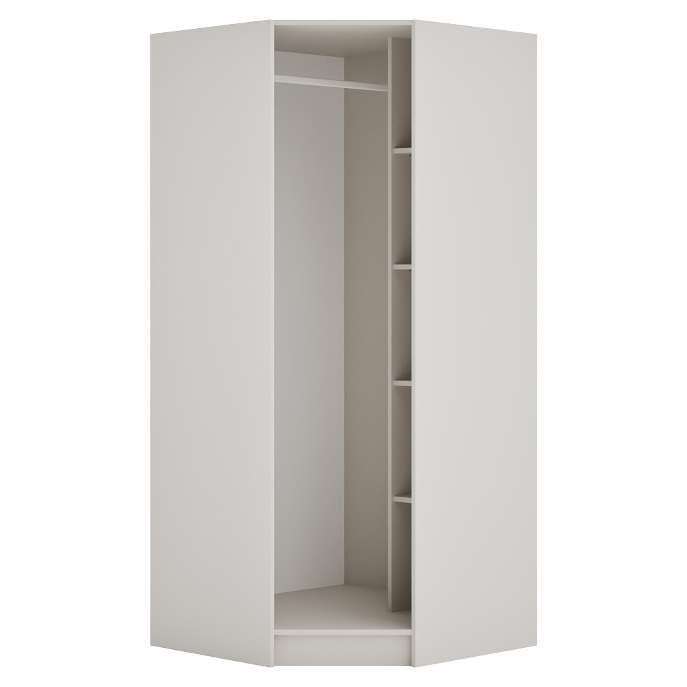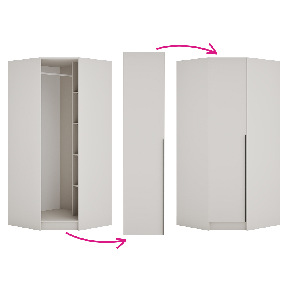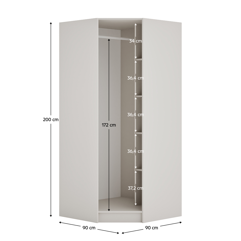 Rohový korpus skrine KREO je praktickým prvkom modulárneho systému, ktorý ponúka prehľadný úložný priestor v rohovom prevedení. Vnútorné usporiadanie tvorí kombinácia políc a vešiakovej tyče, vďaka čomu poskytuje dostatok miesta na uloženie oblečenia aj doplnkov, ktoré chcete mať vždy poruke, a zároveň umožňuje zavesenie kabátov či dlhších odevov. Korpus je vyrobený z laminovanej DTD dosky s ABS hranami v modernom kašmírovom prevedení. Hrúbka DTD materiálu je 1,6 cm a ABS hrán 0,045 cm. Skriňa má rozmery (ŠxHxV): 90x90x200 cm a je dodávaná ako otvorená, policová a rohová. Nosnosť každej police je 5 kg a rovnakú nosnosť má aj vešiaková tyč. Pre jednotný vzhľad je možné korpus kombinovať s odtieňom dub artisan. Dodáva sa bez dvierok, pričom ho môžete doplniť o nízke rohové dvierka systému Kreo. Predvŕtané otvory pre montáž pántov sa nachádzajú na oboch stranách, čo umožňuje flexibilné riešenie. Z bezpečnostných dôvodov sa odporúča korpus pripevniť k stene. Produkt je dodávaný v demonte pre jednoduchšiu prepravu a manipuláciu.