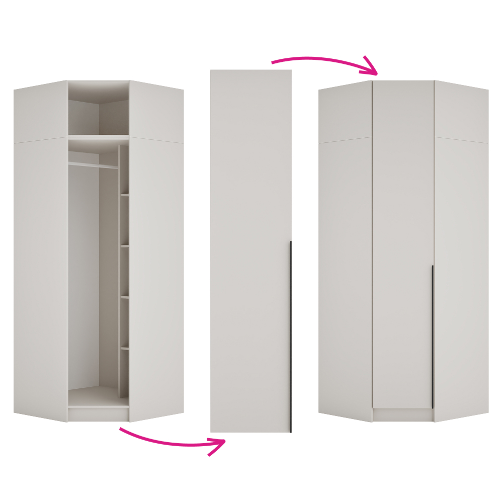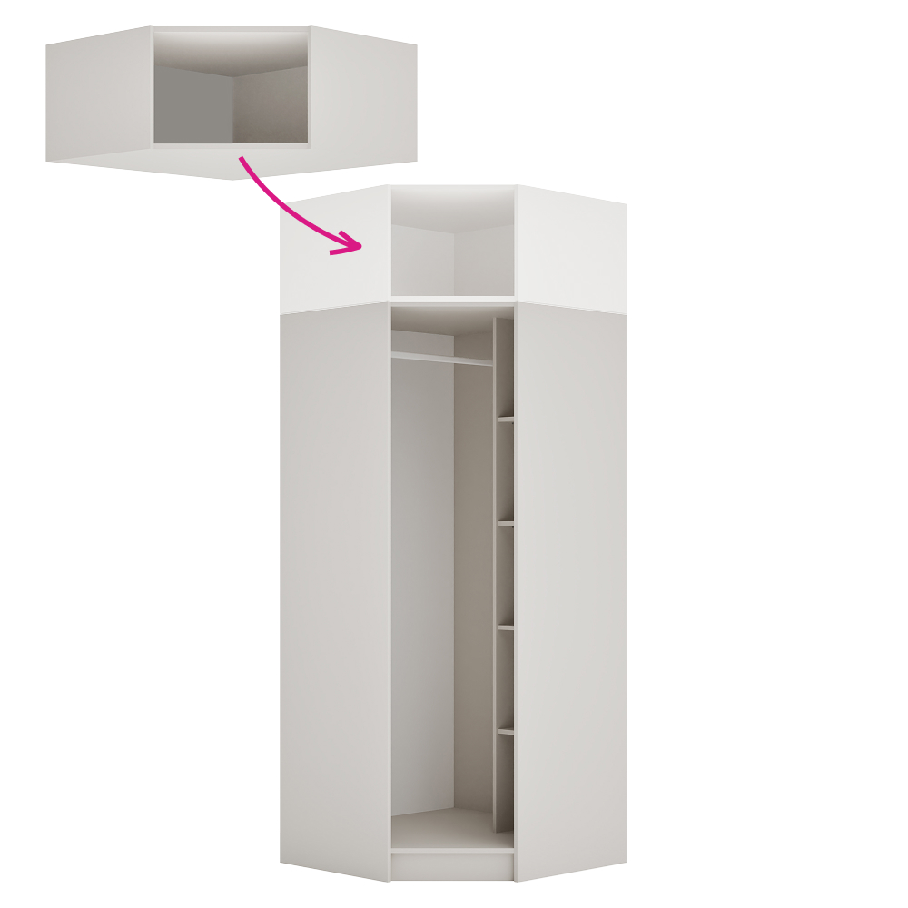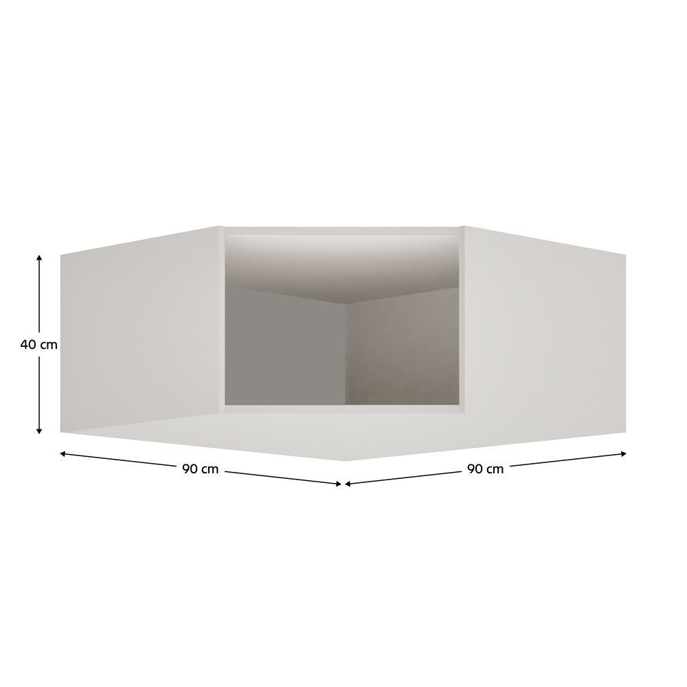 Rohový nadstavec KREO je praktickým doplnkom modulárneho systému, ktorý umožňuje účinne využiť roh miestnosti a zároveň rozšíriť vašu zostavu. Pomáha vytvoriť ucelené a funkčné riešenie úložného priestoru. Pre jednotný a uzavretý vzhľad je možné nadstavec doplniť o vysoké rohové dvierka z kolekcie Kreo. Vyrobený je z laminovanej DTD s ABS hranami v dekore kašmír. Rozmery nadstavca sú (ŠxHxV): 90x90x40 cm, pričom hrúbka DTD materiálu je 1,6 cm a ABS hrán 0,045 cm. Ide o otvorený rohový prvok s nosnosťou do 5 kg, ktorý možno kombinovať aj s odtieňom kašmír. Dodáva sa bez skrine a odporúča sa použiť ho spolu s rohovým korpusom Kreo. Produkt je dodávaný bez dvierok, no obsahuje predvŕtané otvory na montáž pántov z oboch strán, takže ho možno doplniť o vysoké rohové dvierka. Pre väčšiu stabilitu sa odporúča pripevnenie k stene. Nadstavec sa dodáva v demonte.