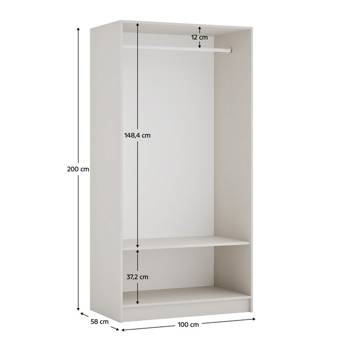 Korpus vešiakovej skrine KREO 100 je praktickou súčasťou modulárneho systému, ktorý ponúka prehľadný úložný priestor s kombináciou police a vešiakovej tyče. Polica poskytuje dostatok miesta na uloženie oblečenia či doplnkov, ktoré chcete mať vždy po ruke, zatiaľ čo vešiaková tyč umožňuje pohodlné zavesenie kabátov. Pre jednotný a uzavretý vzhľad je možné skriňu doplniť o dve nízke dvierka systému Kreo, dostupné v plnom prevedení alebo so zrkadlom. Nábytok je vyrobený z laminovanej DTD s ABS hranami v farebnom prevedení kašmír. Rozmery skrine sú (ŠxHxV): 100x58x200 cm, pričom hrúbka DTD materiálu je 1,6 cm a ABS hrán 0,045 cm. Ide o otvorenú skriňu s jednou policou a vešiakovou tyčou, pričom nosnosť police je 10 kg a vešiakovej tyče 5 kg. Možno ju kombinovať aj s dekorom dub artisan. Dodáva sa bez dvierok, no je pripravená na ich montáž vďaka predvŕtaným otvorom na oboch stranách. Pre väčšiu stabilitu sa odporúča uchytenie k stene. Produkt sa dodáva v demonte.