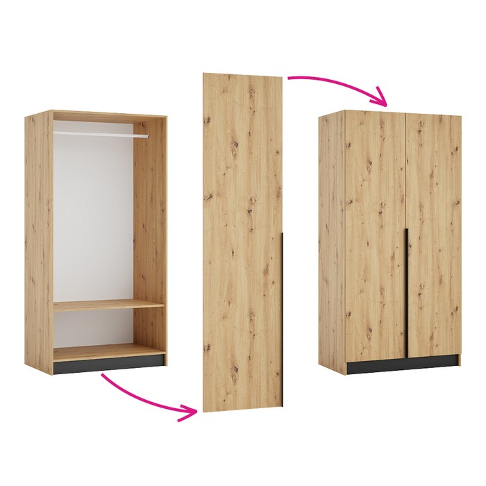 Korpus vešiakovej skrine KREO 100 je praktickou súčasťou modulárneho systému, ktorý ponúka prehľadný úložný priestor s kombináciou police a vešiakovej tyče. Polica poskytuje dostatok miesta na uloženie oblečenia či doplnkov, ktoré chcete mať vždy po ruke, zatiaľ čo vešiaková tyč umožňuje pohodlné zavesenie kabátov. Pre jednotný a uzavretý vzhľad je možné skriňu doplniť o dve nízke dvierka systému Kreo, dostupné v plnom prevedení alebo so zrkadlom. Nábytok je vyrobený z laminovanej DTD s ABS hranami v farebnom prevedení dub artisan. Rozmery skrine sú (ŠxHxV): 100x58x200 cm, pričom hrúbka DTD materiálu je 1,6 cm a ABS hrán 0,045 cm. Ide o otvorenú skriňu s jednou policou a vešiakovou tyčou, pričom nosnosť police je 10 kg a vešiakovej tyče 5 kg. Možno ju kombinovať aj s dekorom kašmír. Dodáva sa bez dvierok, no je pripravená na ich montáž vďaka predvŕtaným otvorom na oboch stranách. Pre väčšiu stabilitu sa odporúča uchytenie k stene. Produkt sa dodáva v demonte.