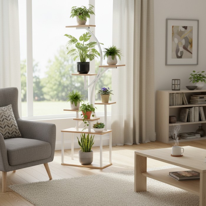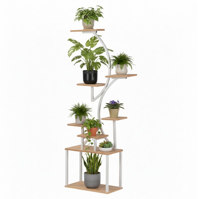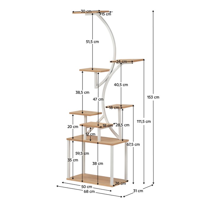 Moderný stojan na kvety FLOREL zaujme originálnou zakrivenou konštrukciou a praktickým viacúrovňovým usporiadaním políc, ktoré poskytuje dostatok priestoru na vystavenie kvetov, rastlín aj dekorácií. Pomôže tak jednoducho oživiť prázdny kút miestnosti a vytvoriť z rastlín peknú dekoráciu. Police sú vyrobené z laminovanej MDF v odtieni dub sonoma, ktorý pôsobí prirodzene a ľahko sa kombinuje s rôznymi štýlmi bývania. Stabilitu zabezpečuje pevná kovová konštrukcia v bielej farbe. Stojan je vyrobený z kombinácie kovu a laminovanej MDF, pričom farebné prevedenie tvorí biela a dub sonoma. Jeho rozmery sú (ŠxHxV): 68x31x153 cm a hrúbka MDF materiálu je 1,6 cm. Vďaka štíhlemu dizajnu sa hodí do obývačky, chodby aj kancelárie a slúži ako praktický stojan na črepníkové rastliny s policami. Nosnosť každej police je 2,5 kg, pričom sa odporúča ich rovnomerné zaťaženie. Stojan je praktický, viacúčelový, vyhotovený v modernom štýle a dodáva sa v demonte.